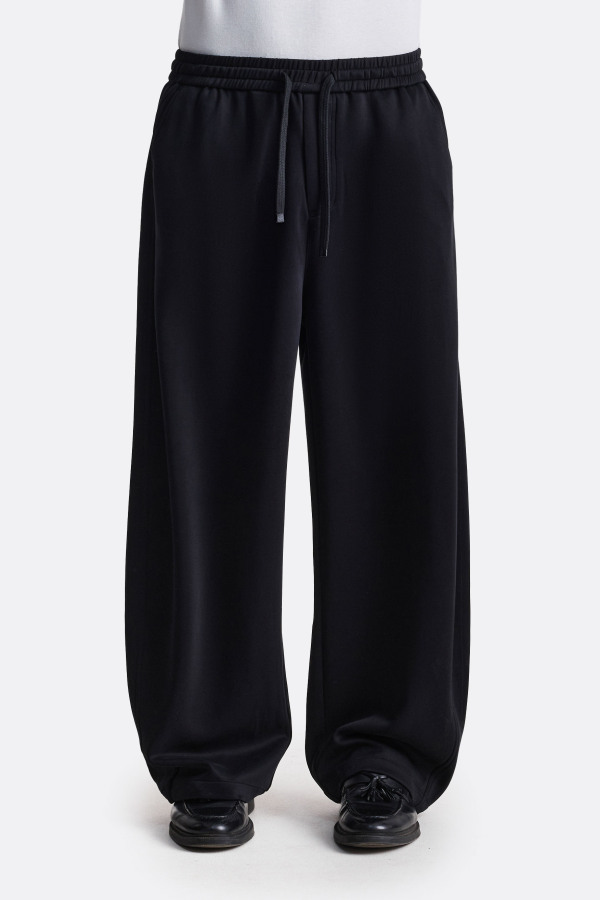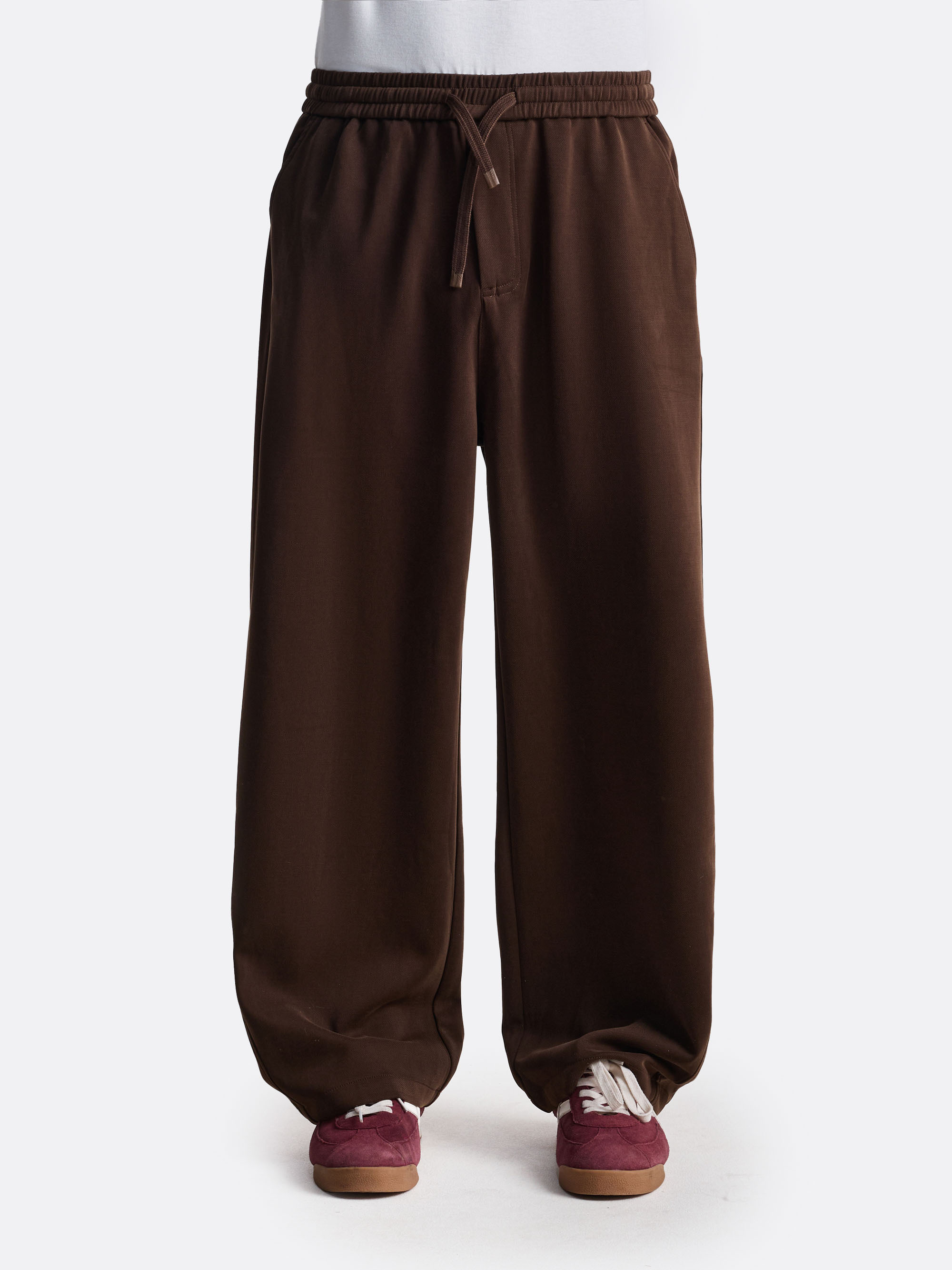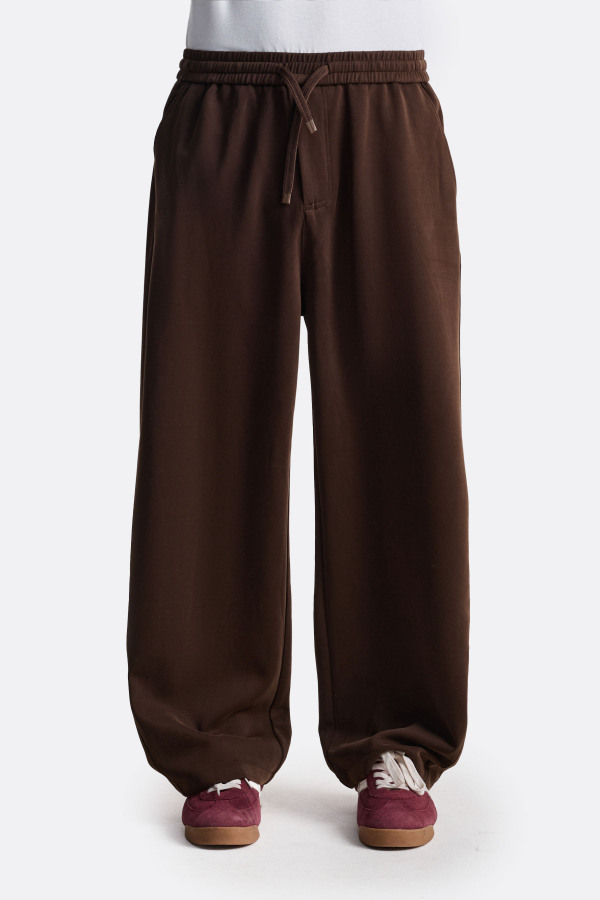 Брюки свободного силуэта с акцентом на объём. Широкие прямые штанины формируют расслабленный силуэт и естественную динамику движения. Пояс на резинке дополнен кулиской для удобной регулировки посадки. Модель представлена в чёрном и тёплом коричневом оттенках и легко вписывается в повседневные и стрит-образы.