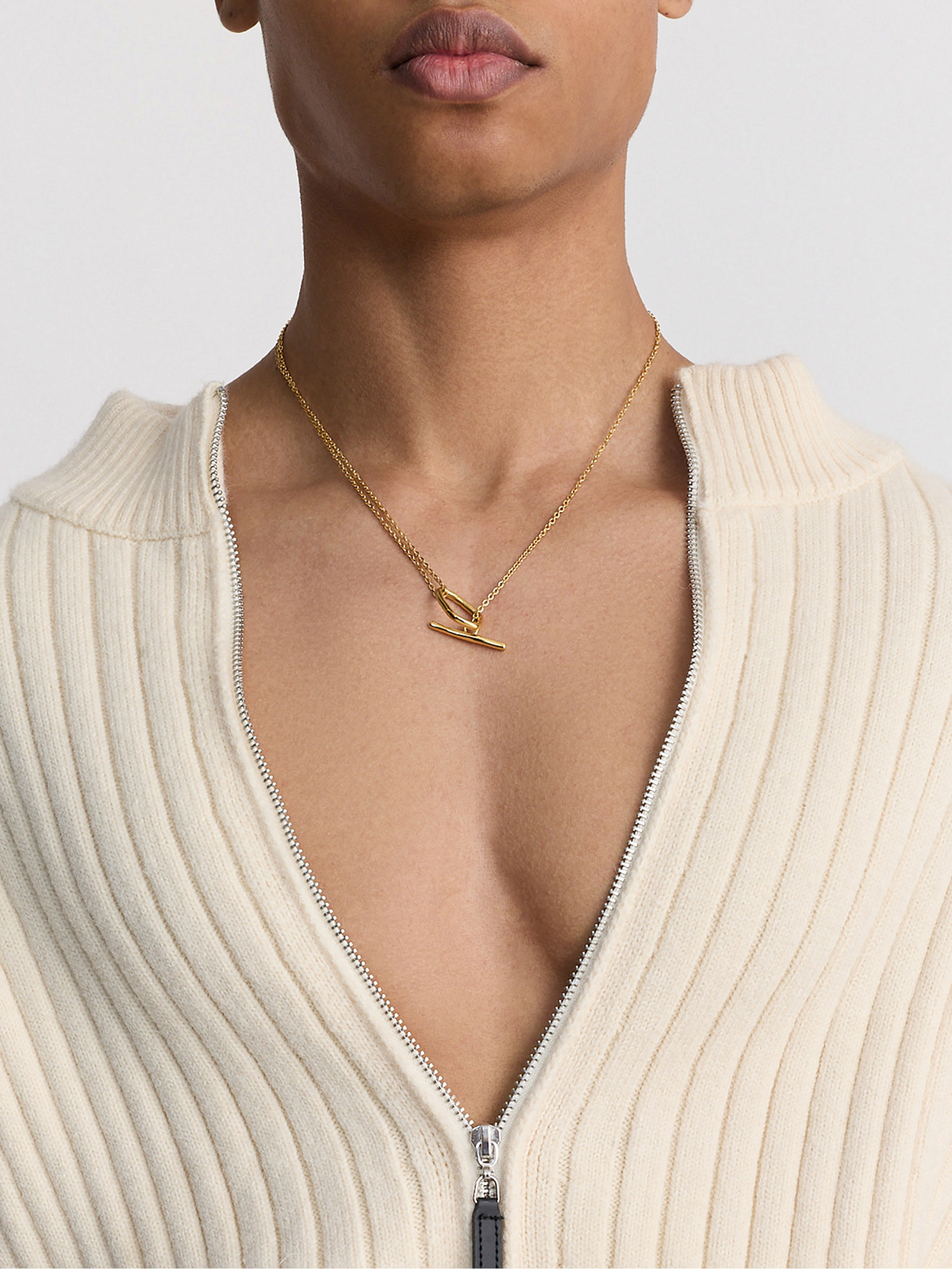 Подвеска с асимметричным звеном и удлинённым баром на тонкой цепи. Живая пластика металла создаёт неровный, почти органичный контур. Лёгкий блеск металла подчёркивает объём деталей без лишнего «шума».