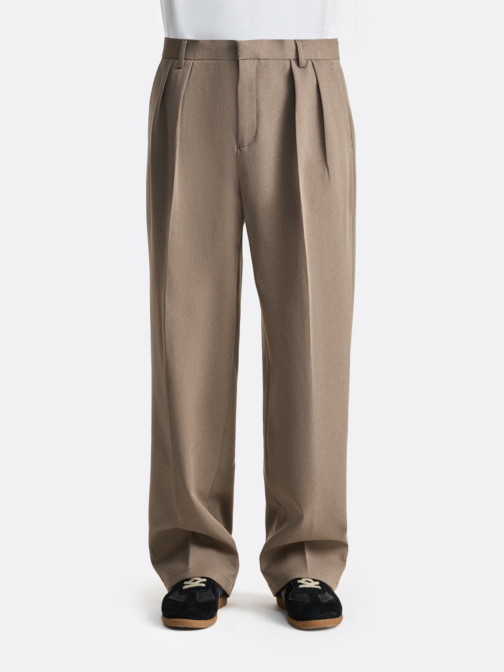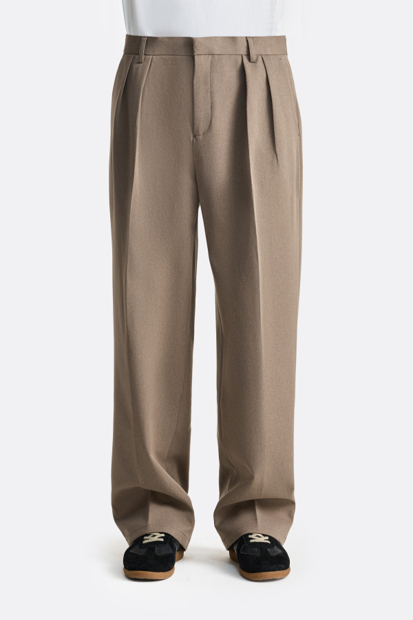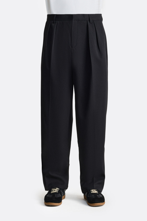 Брюки с продуманной посадкой — складки у пояса добавляют объёма в верхней части и задают мягкую архитектуру силуэта. Классическая посадка, аккуратные карманы и пояс со шлёвками поддерживают сдержанный характер модели. За счёт фасона брюки легко держат форму, благодаря чему силуэт выглядит цельно — как в составе костюмной группы, так и самостоятельно.