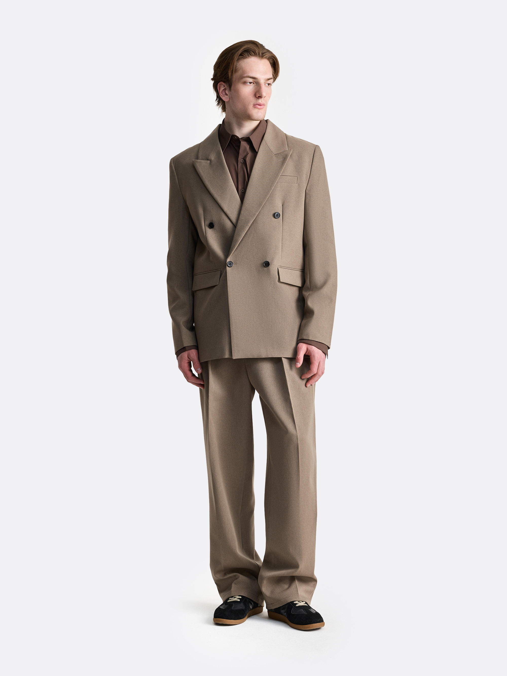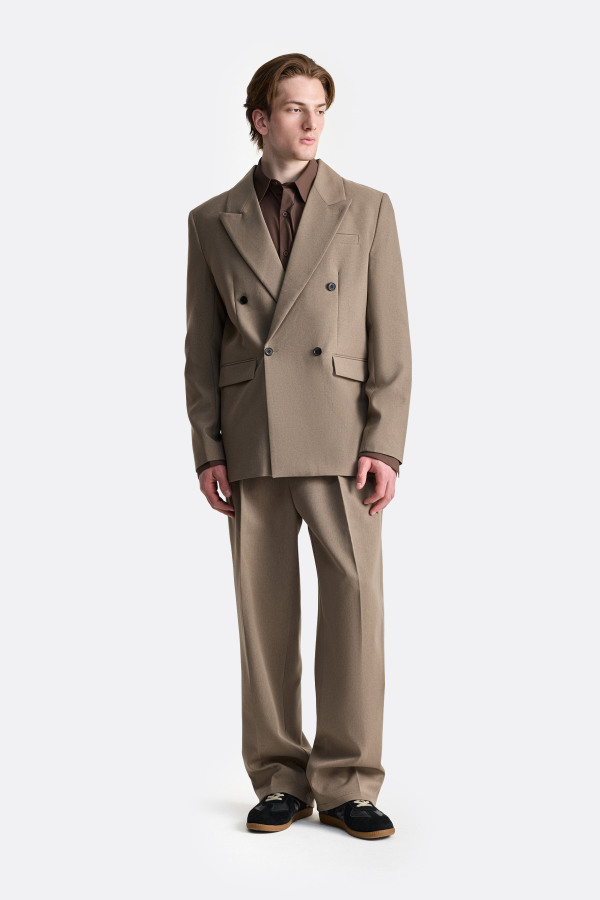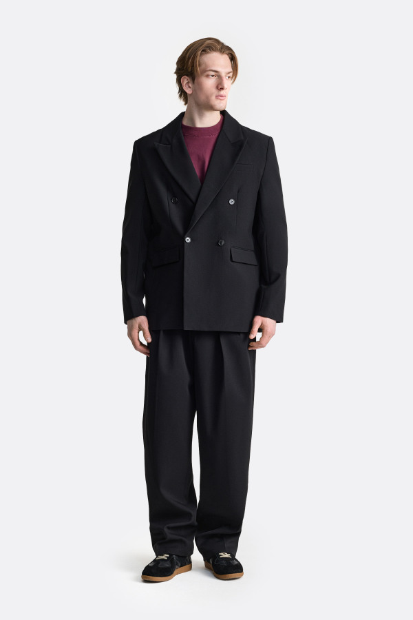 Пиджак с чётко выстроенной формой и линией плеч. Широкие лацканы формируют акцент в верхней части силуэта, а двубортная конструкция, аккуратный нагрудный карман и клапаны по бокам поддерживают структурность изделия. Ткань держит форму и подчёркивает архитектуру пиджака, при этом посадка остаётся свободной, благодаря чему модель не будет перегружать классический образ, а также отлично смотреться в рамках костюмной группы.