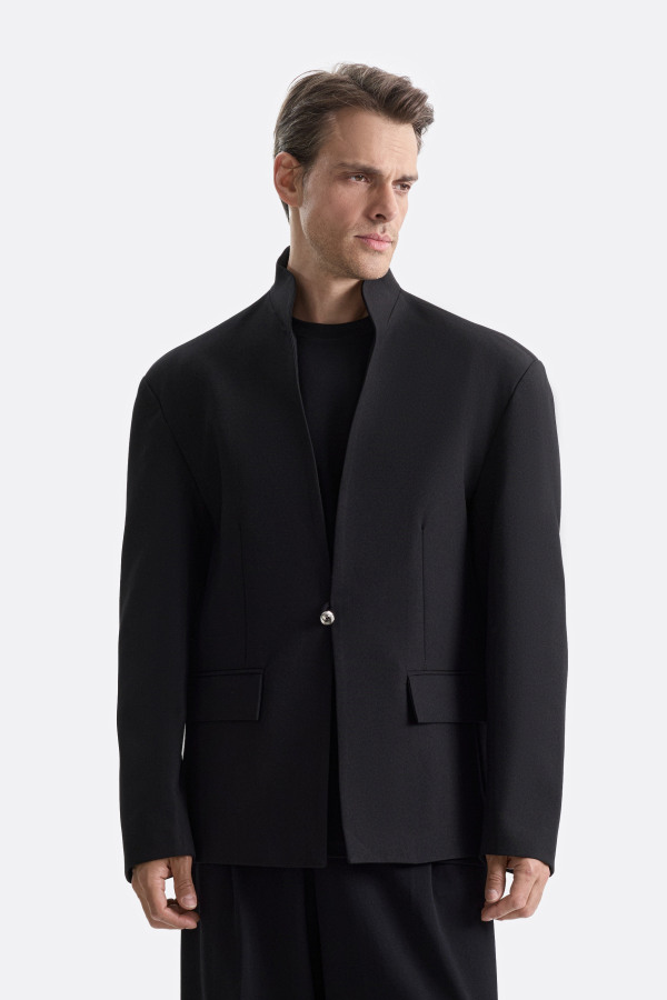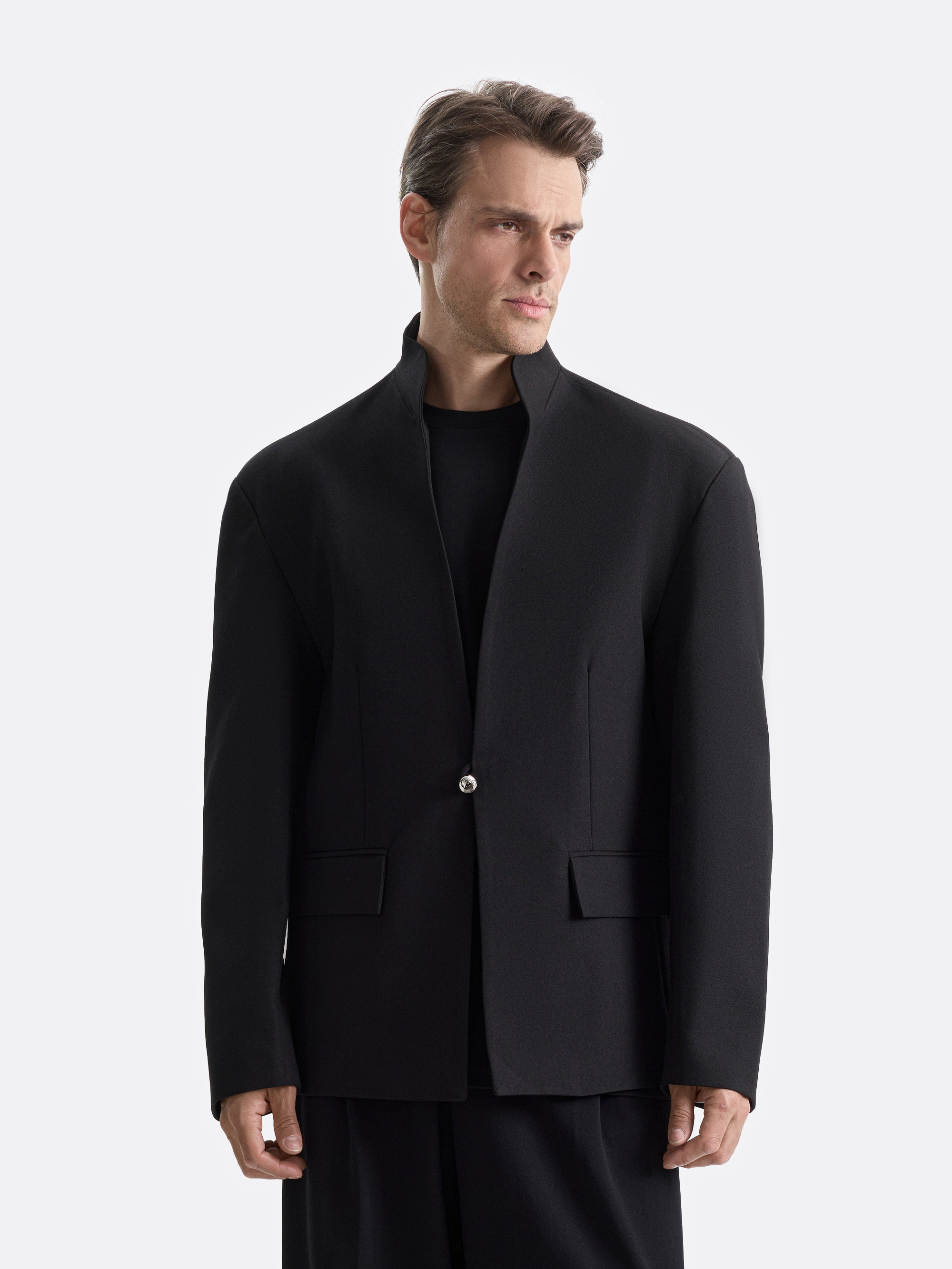 Пиджак строгого силуэта с выразительным воротником-стойкой и застёжкой на одну пуговицу. Эстетика минимализма дополнена двумя прорезными клапанами спереди — без привычных лацканов, но с чёткой архитектурой линий.