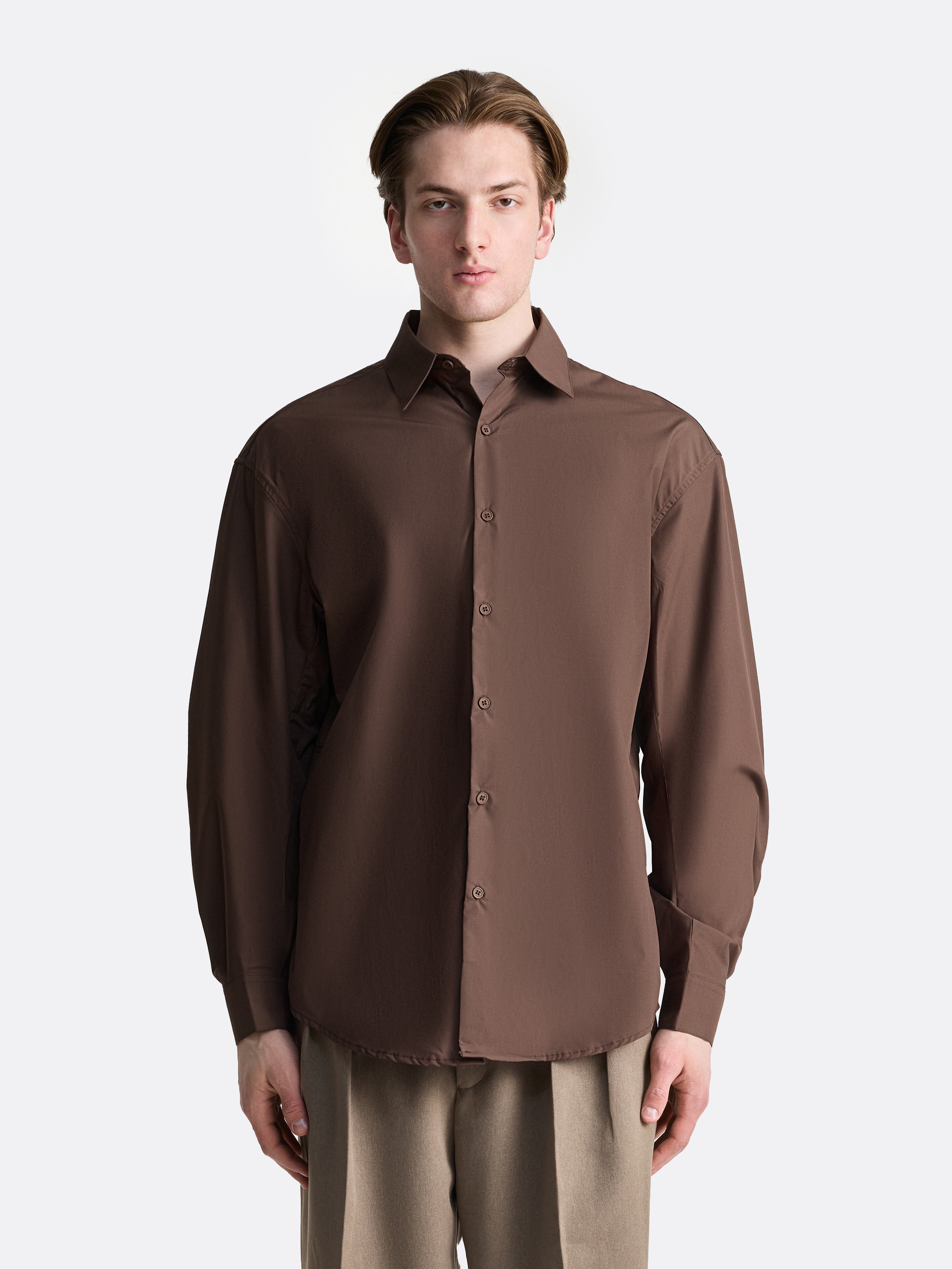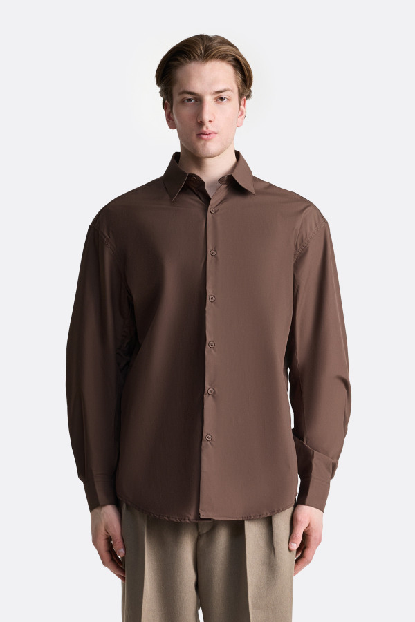 Рубашка с акцентом на конструкцию и графику швов. По корпусу и рукавам проходит система декоративных строчек, которые формируют выразительную архитектуру изделия. Традиционный воротник, аккуратная планка на пуговицах и манжеты подчеркивают классический характер модели, а многочисленные конструктивные швы добавляют глубину и фактуру даже в однотонной ткани.