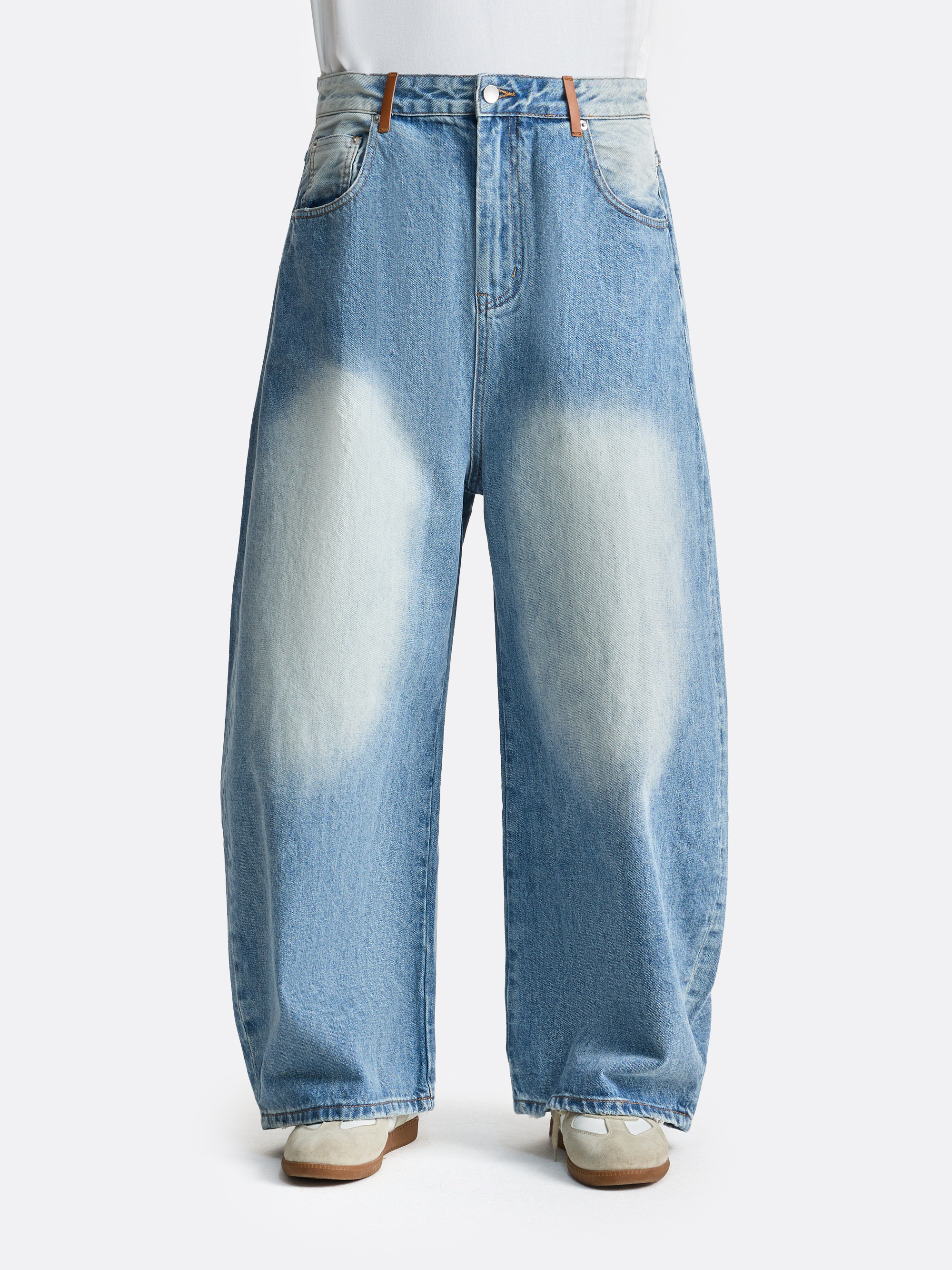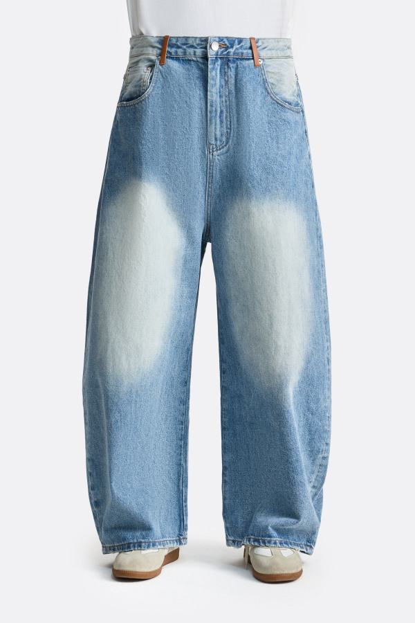 Широкие джинсы свободного силуэта и примечательным выбеленным эффектом, создающим мягкие световые переходы на ткани. Плотный деним хорошо держит форму, при этом остаётся комфортным в носке. Классическая посадка с акцентными шлевками на поясе делает модель отличным вариантом для современных городских сочетаний.