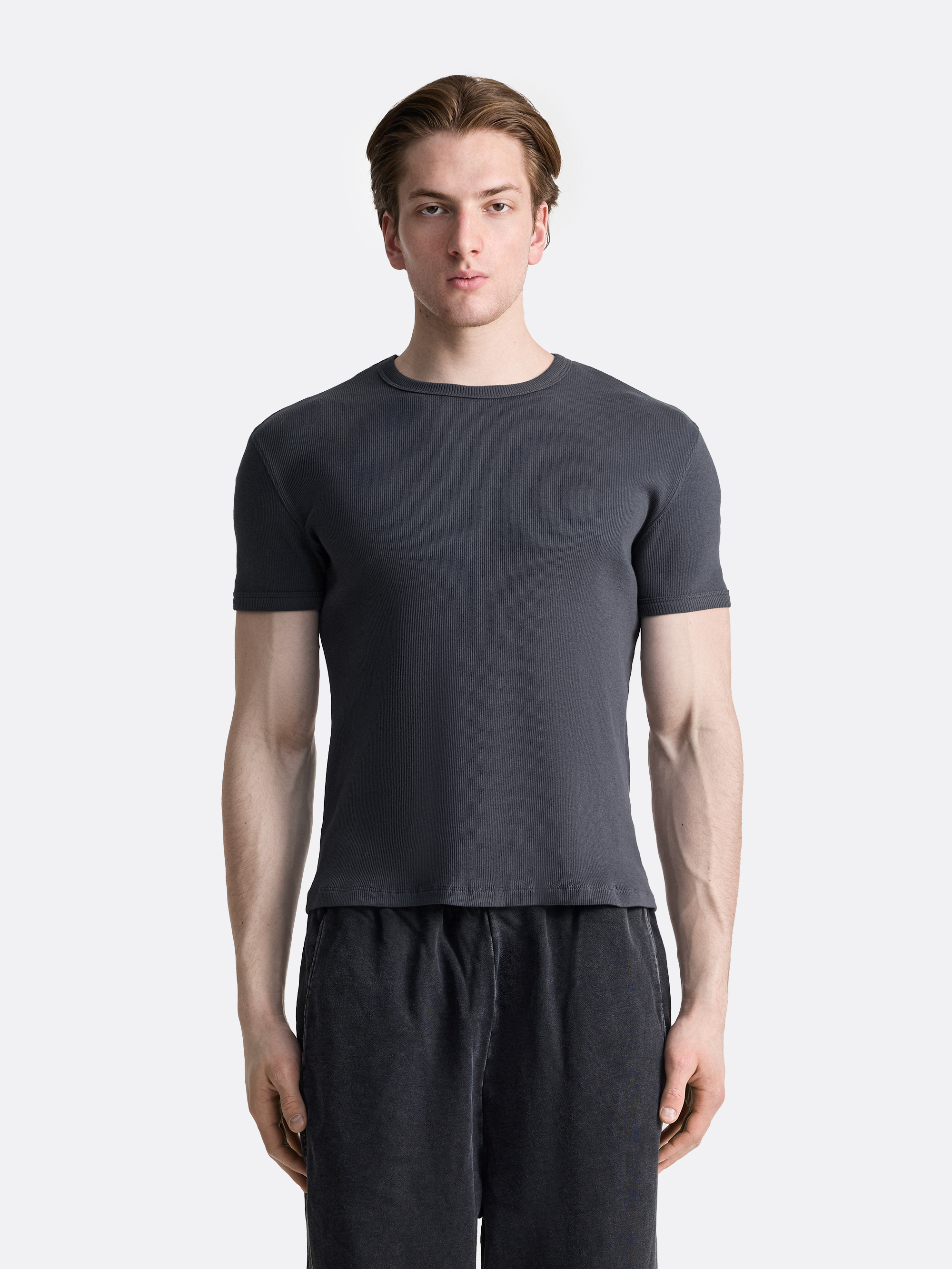 Футболка с лаконичным дизайном и аккуратной посадкой по фигуре. Классический круглый вырез и короткий рукав формируют универсальный силуэт, который легко вписывается в повседневный гардероб. Материал с лёгкой фактурой в рубчик добавляет глубину базовой модели и делает ее более выразительной как самостоятельный элемент образа, а также как основу для многослойных сочетаний.