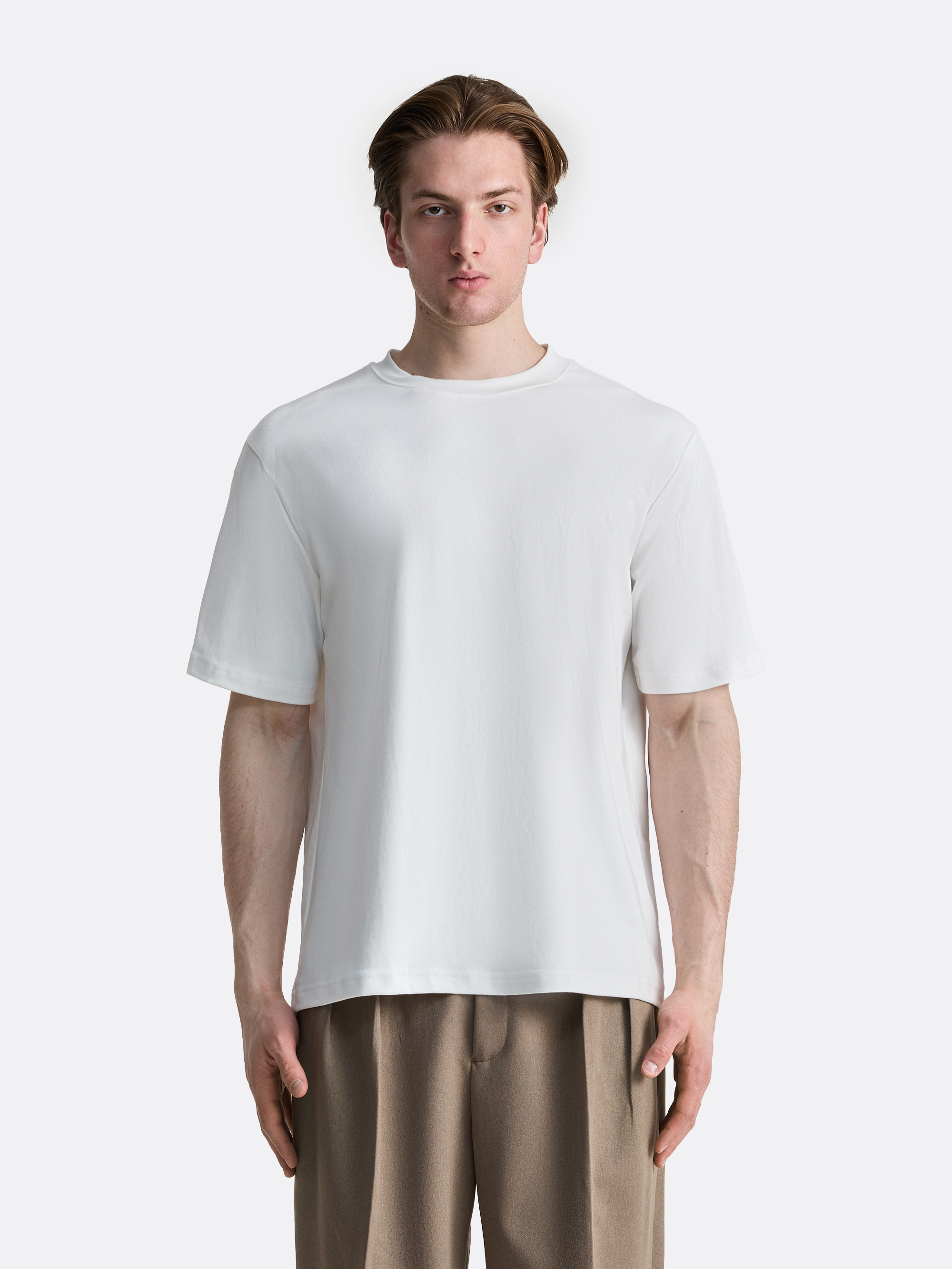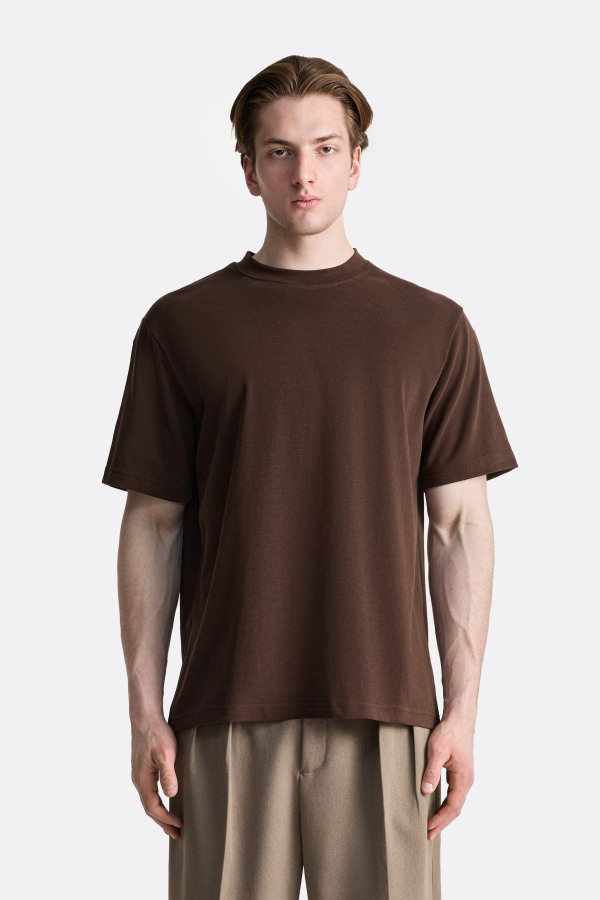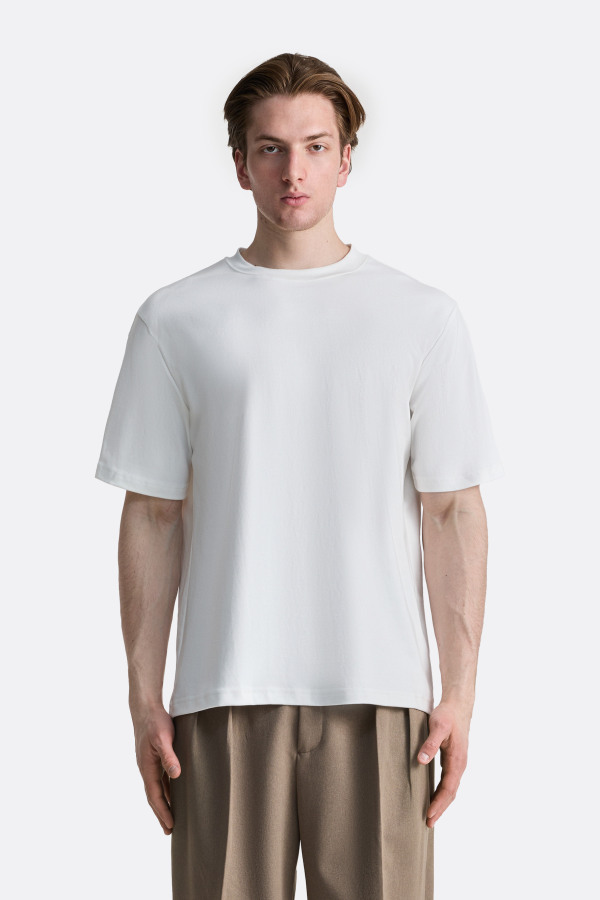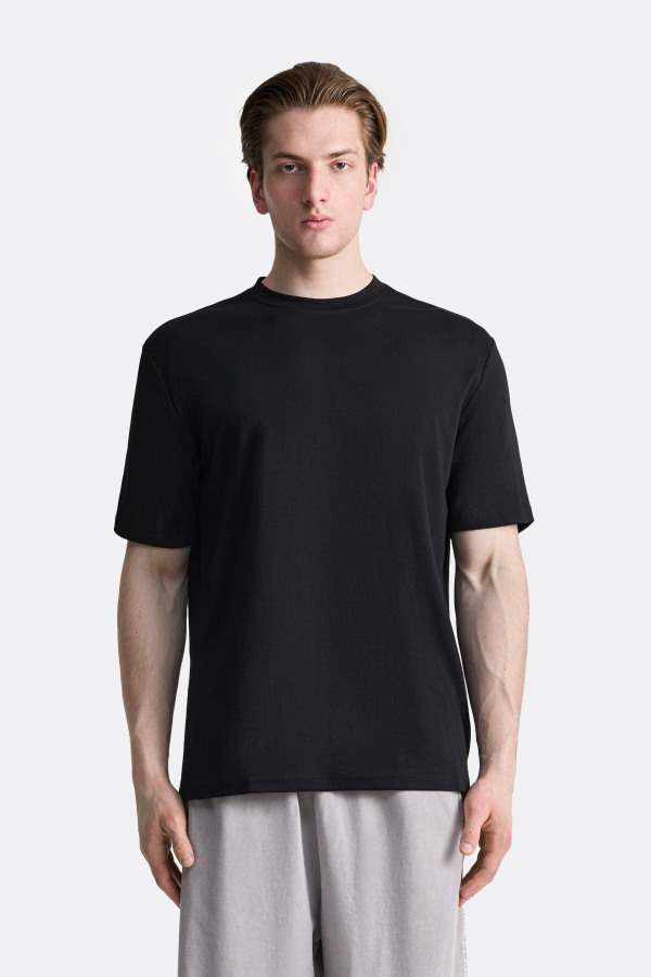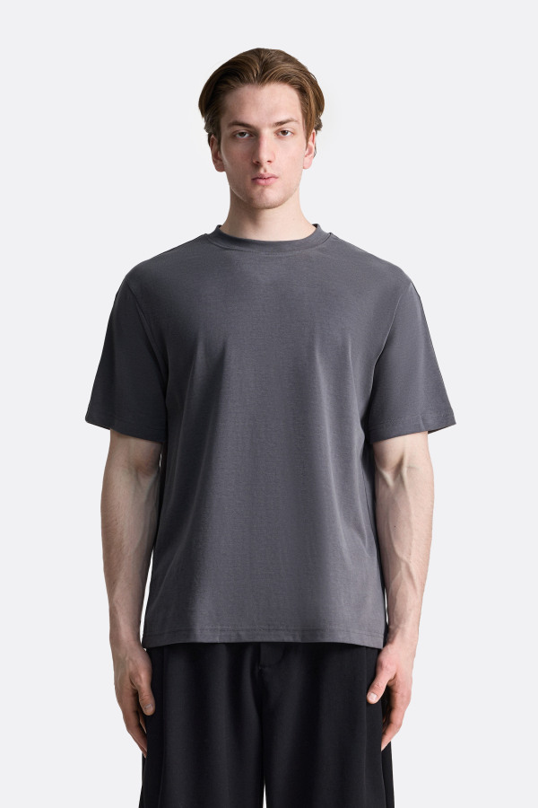Футболка в минималистичном стиле — свободный релакс-фит, чуть удлинённый силуэт и прямой подол. Плотный круглый воротник держит форму, рукава средней длины остаются свободными и не сковывают движения. Палитра оттенков модели универсальна и подходит как для повседневного гардероба, так и для спокойных монохромных образов.
