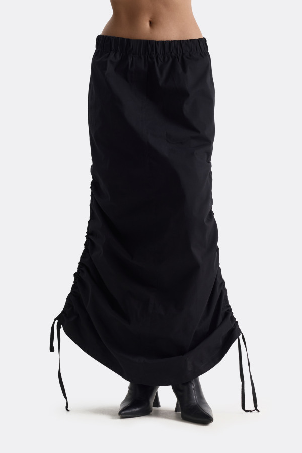 Юбка-макси с дерзким характером и трансформируемой формой. Объёмная посадка на резинке, регулируемые сборки по бокам и декоративные завязки — каждый элемент продуман для игры с пропорциями. Можно носить как прямую, или приподнять край, создав графичный драпированный силуэт. Лёгкий технологичный материал держит форму и создаёт выразительный объем. Юбка, которая не просит компромиссов.