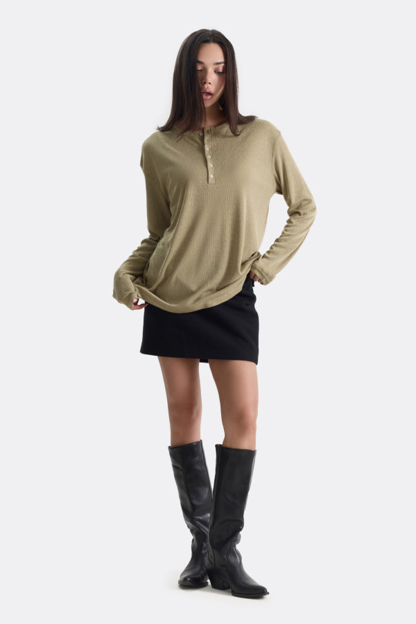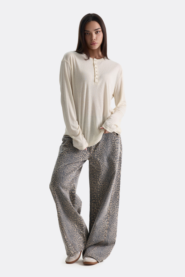 Лонгслив с застёжкой на пуговицах и мягкой округлой горловиной. Полупрозрачная фактурная вязка образует абстрактный узор с рельефной текстурой, создавая световые блики при движении. Удлинённый силуэт с прямыми рукавами и лёгкая, дышащая ткань — комфорт и визуальный интерес в каждой детали.