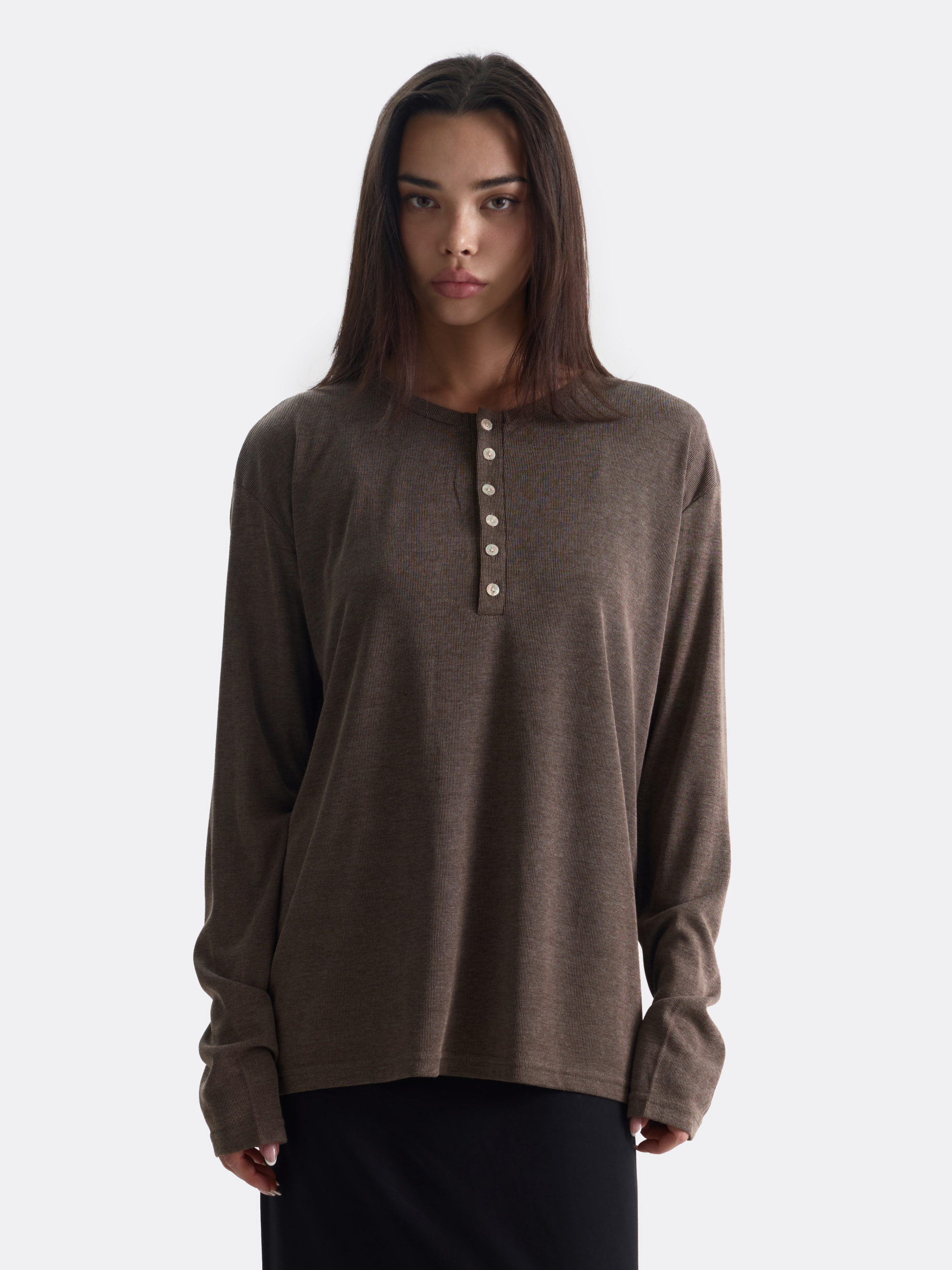 Лонгслив с застёжкой на пуговицах и мягкой округлой горловиной. Полупрозрачная фактурная вязка образует абстрактный узор с рельефной текстурой, создавая световые блики при движении. Удлинённый силуэт с прямыми рукавами и лёгкая, дышащая ткань — комфорт и визуальный интерес в каждой детали.