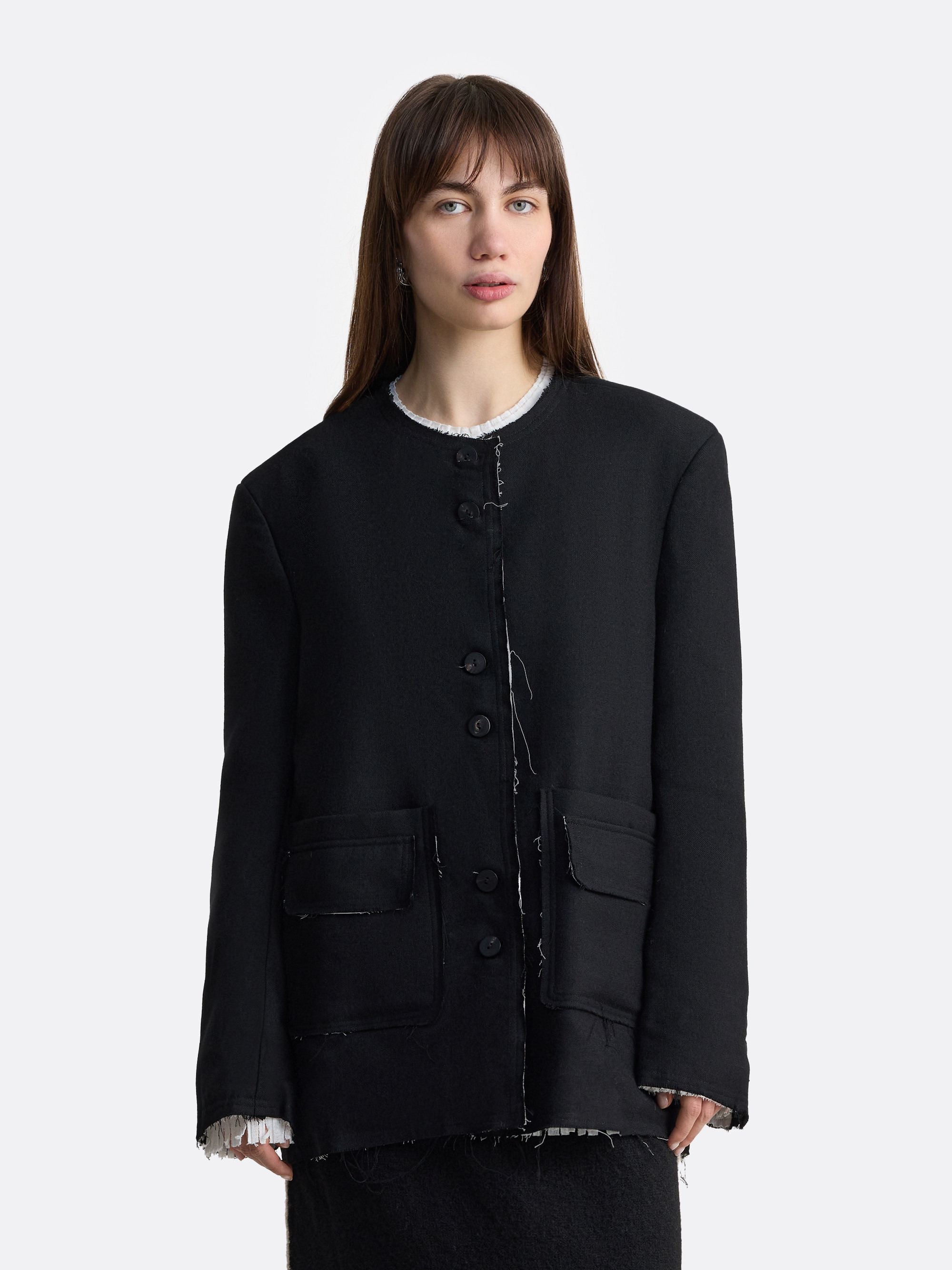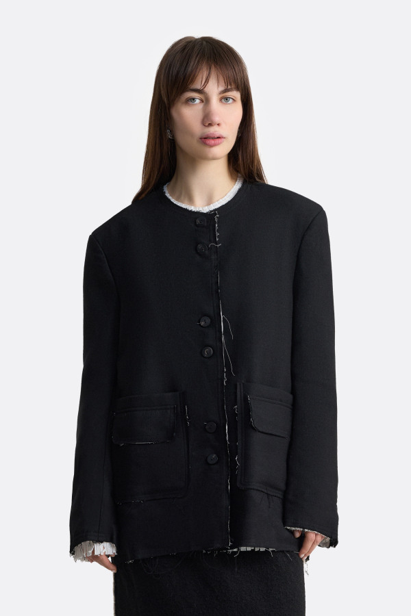 Пиджак прямого силуэта на основе шерсти с мягкой линией плеч и нарочито необработанными срезами по краям. Контрастная белая подкладка слегка выглядывает по периметру, добавляя многослойный эффект. Перед украшен крупными накладными карманами с клапанами, фактурная линия пуговиц подчёркивает графичность. Манжеты с пуговицами, круглая горловина и плотная ткань делают его универсальной вещью на каждый день, но с акцентом.