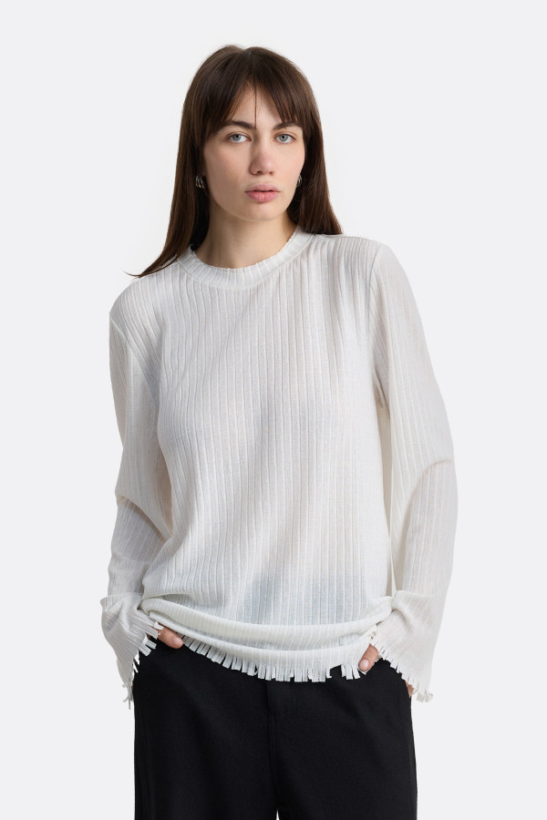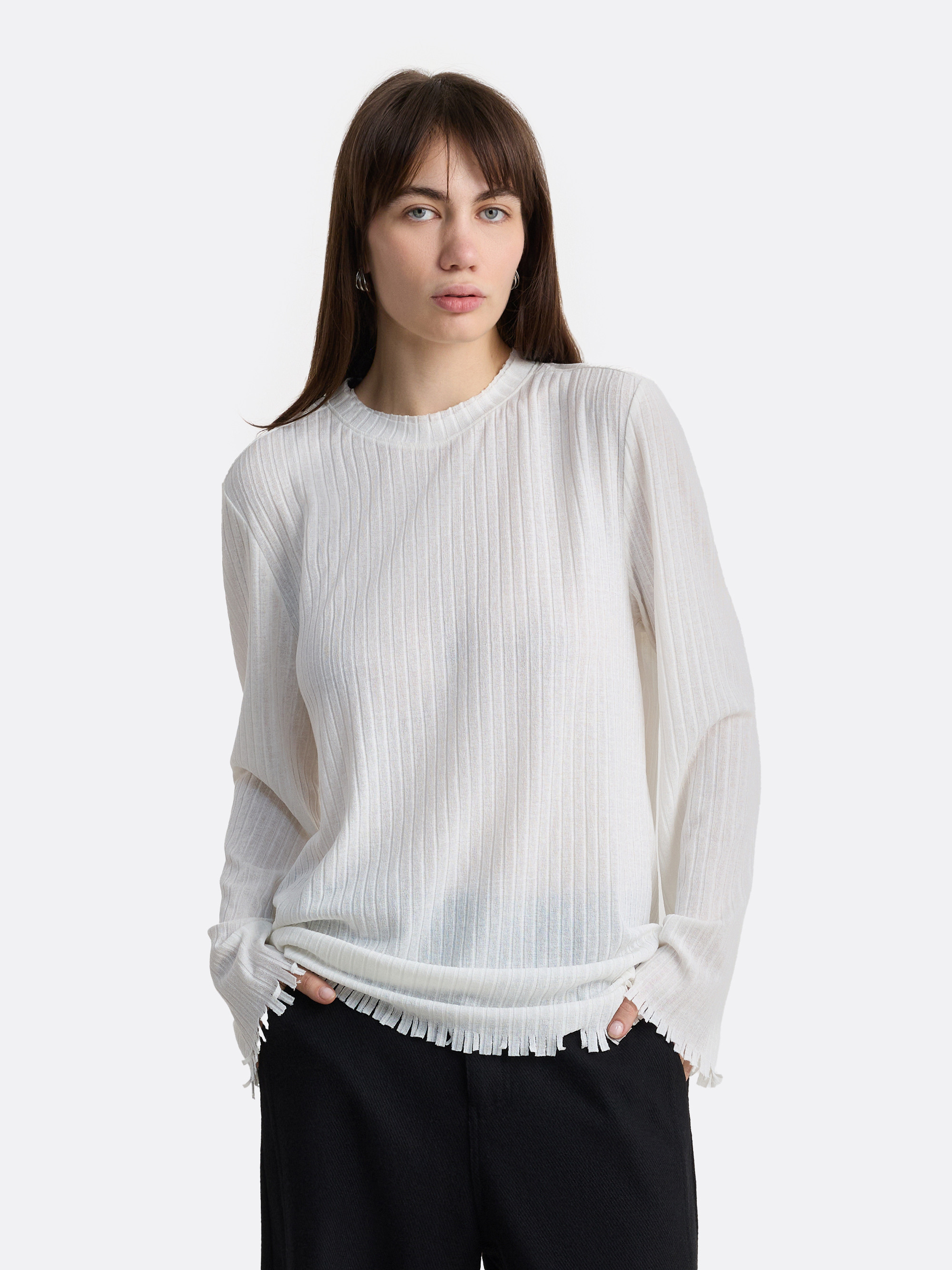 Полупрозрачный лонгслив из тонкого рубчатого материала с деликатным блеском и необработанными краями. Прямой силуэт и круглая горловина подчёркивают лёгкость формы, а короткая бахрома на манжетах и нижнем крае добавляет ироничной небрежности. Мягкая фактура ткани приятно прилегает к телу, создавая полуприлегающий силуэт и подчёркивая вертикаль.