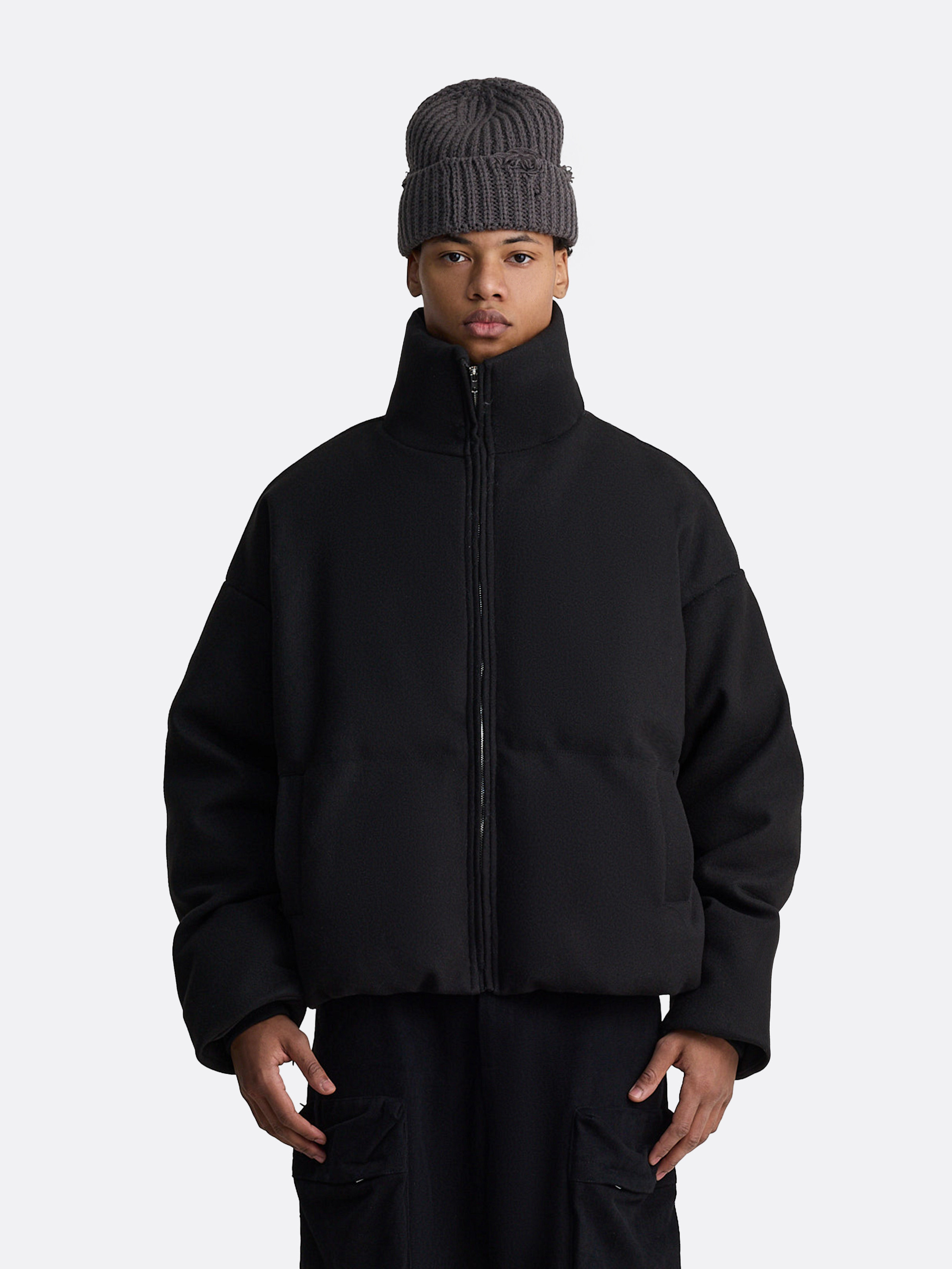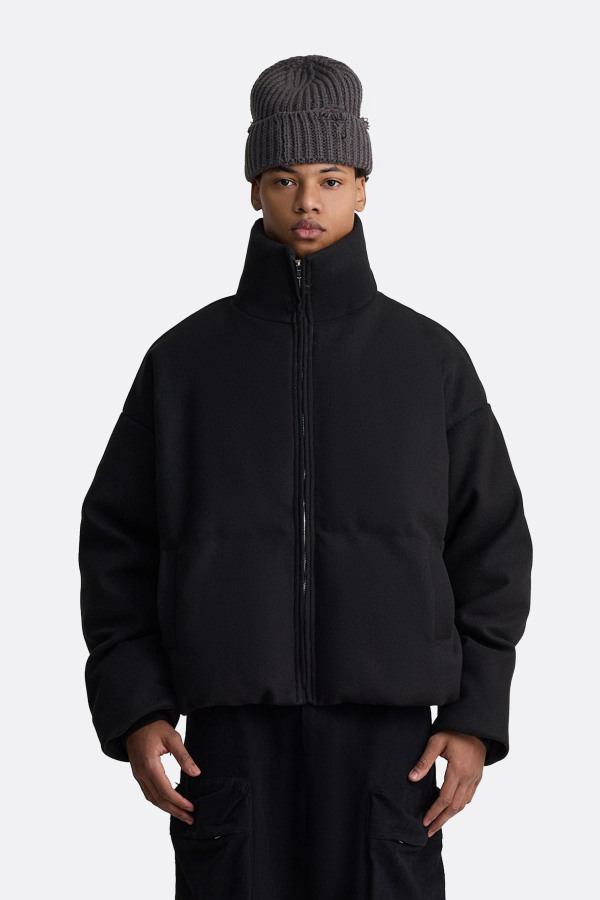 Минималистичный укороченный пуховик с чётким силуэтом и характером. Объёмная форма, высокий воротник-стойка и устойчивая фактура создают ощущение уверенности. Длинные рукава с мягкой посадкой и свободный крой подчёркивают спокойный, но мощный характер изделия. Куртка выполнена из плотного материала с сухой, шероховатой поверхностью. Он держит форму и добавляет глубину однотонному чёрному цвету, создавая ощущение конструктивности и веса. Внутри утеплённая подкладка, которая обеспечивает комфорт и тепло. Сдержанная и цельная форма, где минимализм работает на силу.