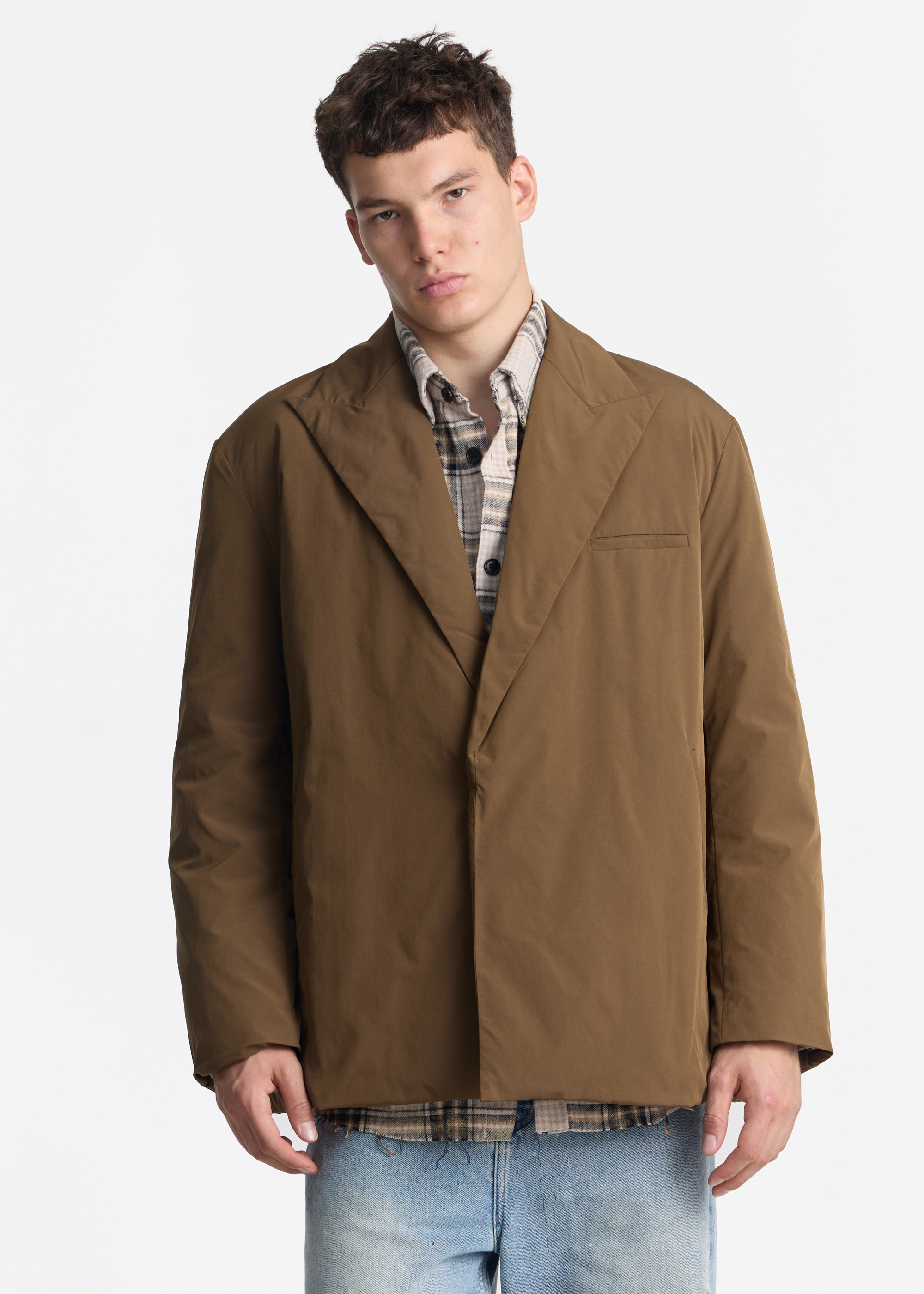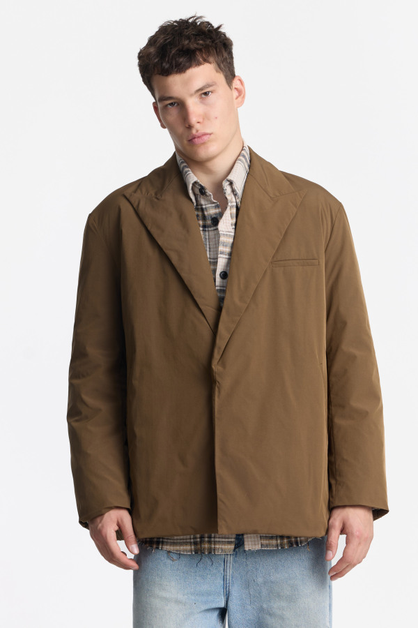 Утеплённый пуховый пиджак с мягкой конструкцией. Минималистичный крой, слегка смещенные линии и широкие лацканы — визуально тяготеет к классике, но это скорее «пиджак наоборот»: с утеплённой подкладкой и шелковистой на ощупь тканью с лёгким техно-оттенком. За счёт плотности и объёма — работает как верхний слой. Пуговицы скрыты, застёжка — на кнопке. Карман на груди. Посадка свободная, почти прямоугольная.