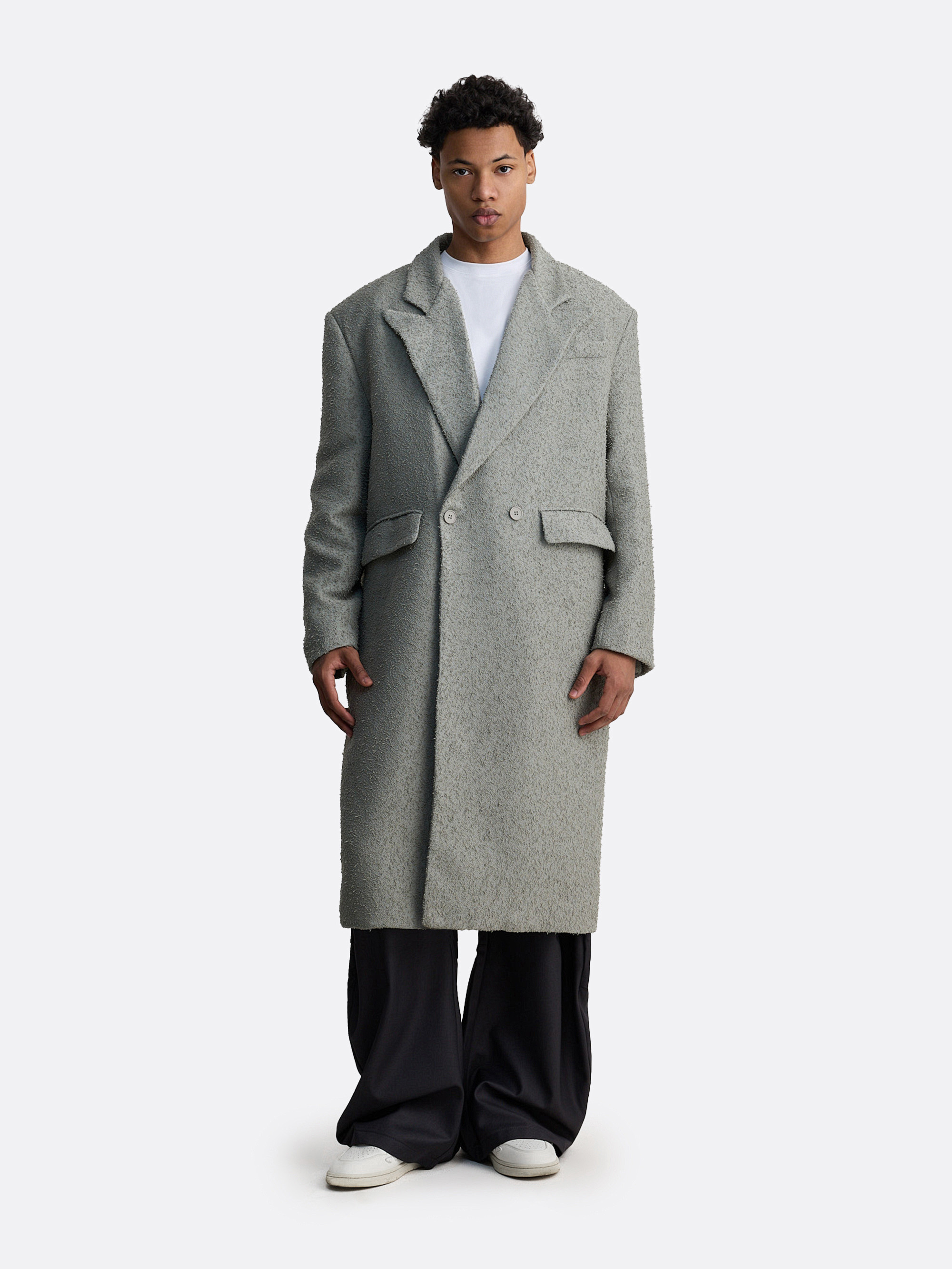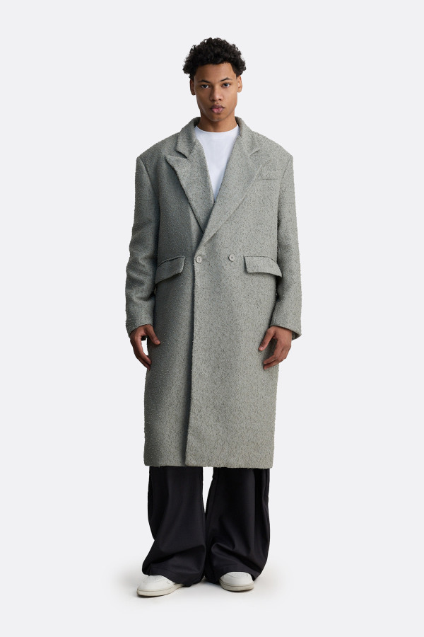 Длинное пальто с подчёркнуто объёмными плечами и ворсом под букле — как будто вышло из винтажного нуара. Чёткие линии лацканов, потайная застёжка на две пуговицы и удлинённый силуэт создают силу притяжения. Визуально лаконичное, но с сильным характером — для тех, кто предпочитает говорить без слов.
