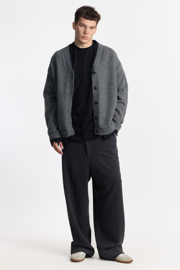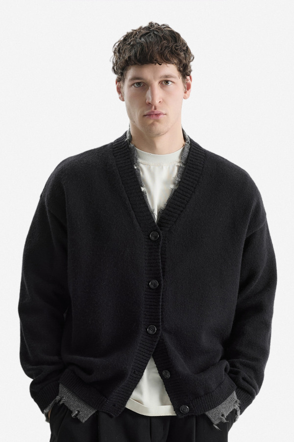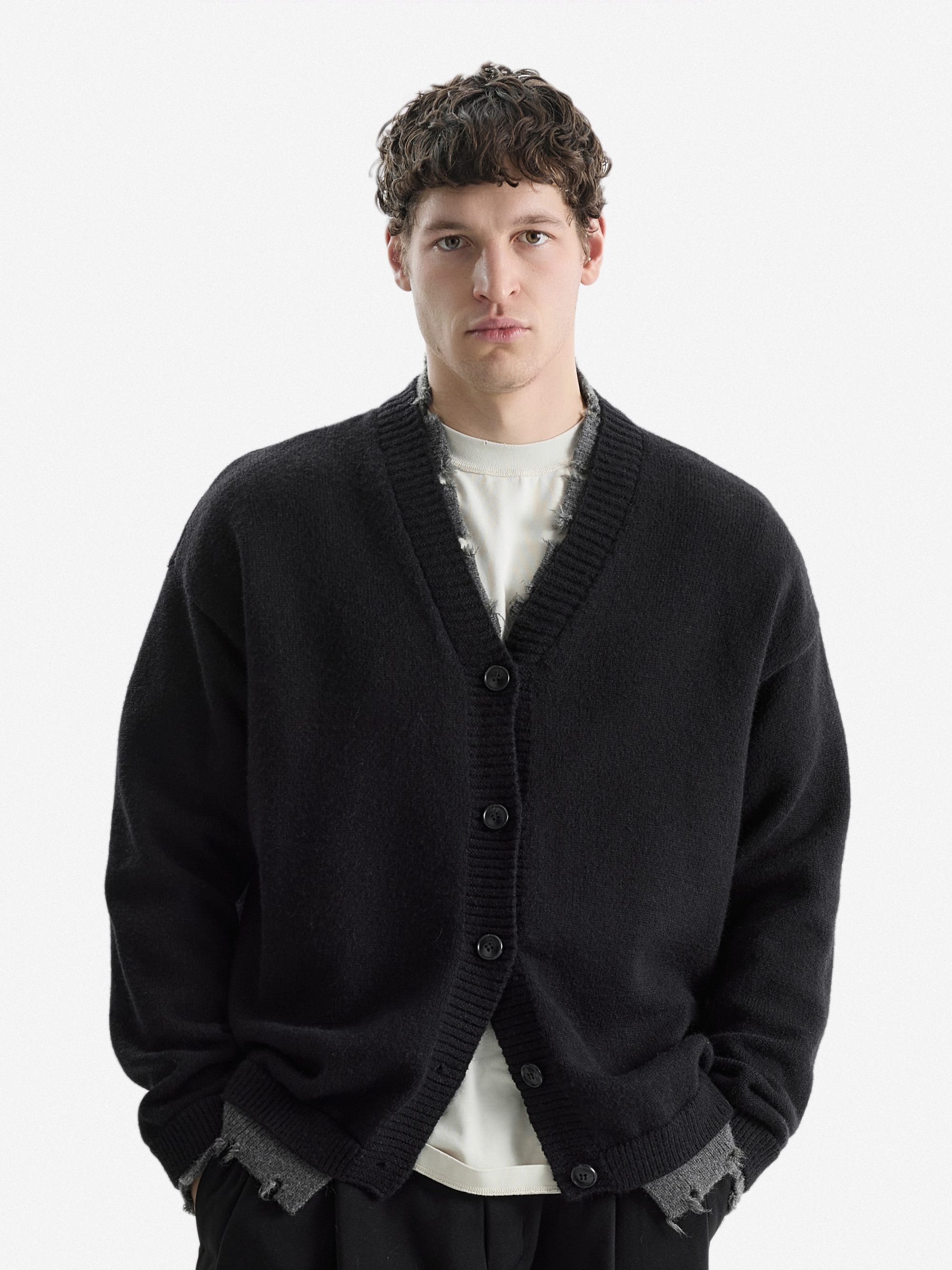 Кардиган свободного силуэта с необработанным краем — будто немного незавершённый, но от этого только более выразительный. Мягкий, плотный трикотаж даёт ощущение уюта, а контрастная подкладка, выглядывающая на манжетах и вороте, добавляет дерзкий акцент. Классическая застёжка на чёрные пуговицы и фактурная планка в рубчик делают вещь универсальной.
