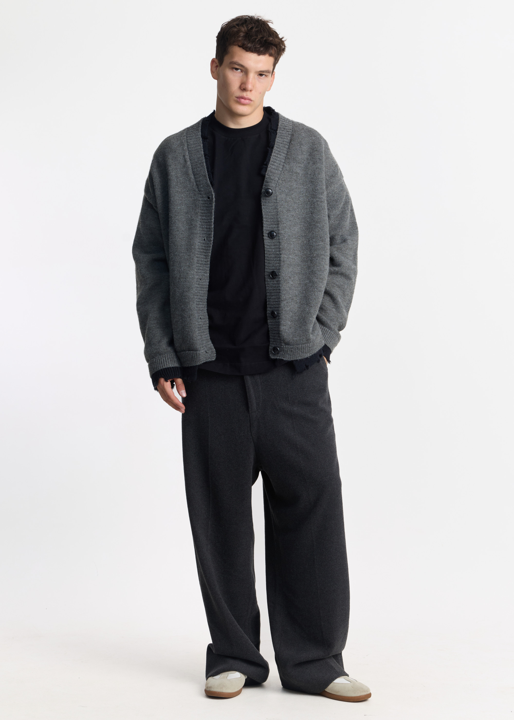 Кардиган свободного силуэта с необработанным краем — будто немного незавершённый, но от этого только более выразительный. Мягкий, плотный трикотаж даёт ощущение уюта, а контрастная подкладка, выглядывающая на манжетах и вороте, добавляет дерзкий акцент. Классическая застёжка на чёрные пуговицы и фактурная планка в рубчик делают вещь универсальной.