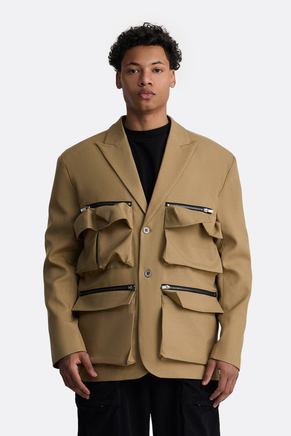 Пиджак-карго архитектурной формы с утилитарным характером. Чёткие линии плеч и прямой силуэт контрастируют с фактурными карманами, собранными в динамичную композицию. Каждый карман снабжён молнией, создавая ощущение функционального хаоса, продуманного до мелочей. Материал плотный, подчёркивает геометрию изделия и придаёт конструкции вес.