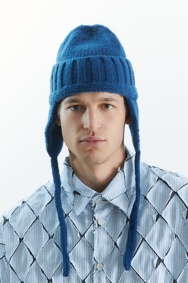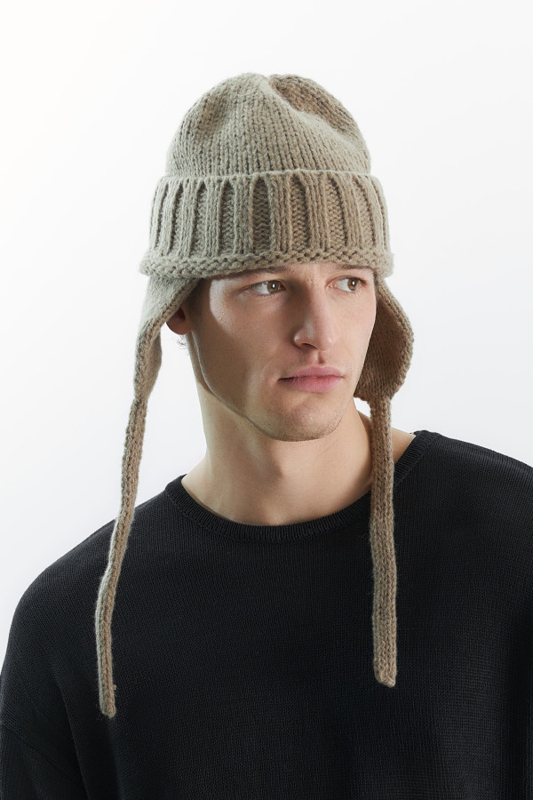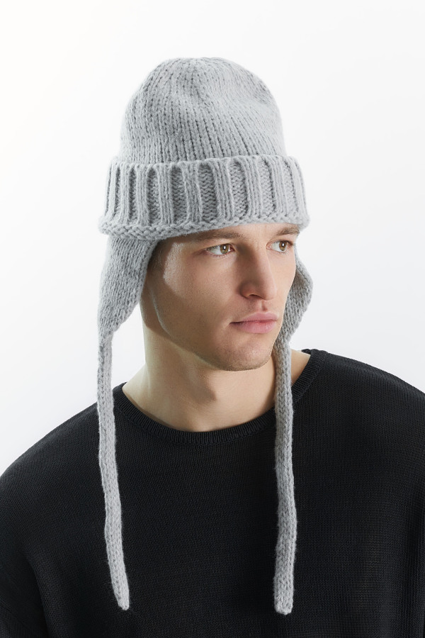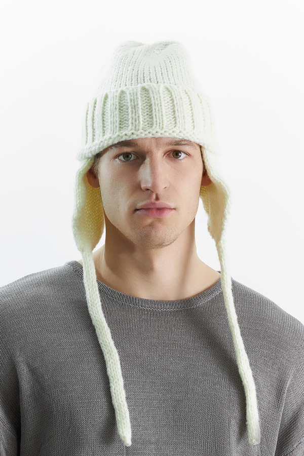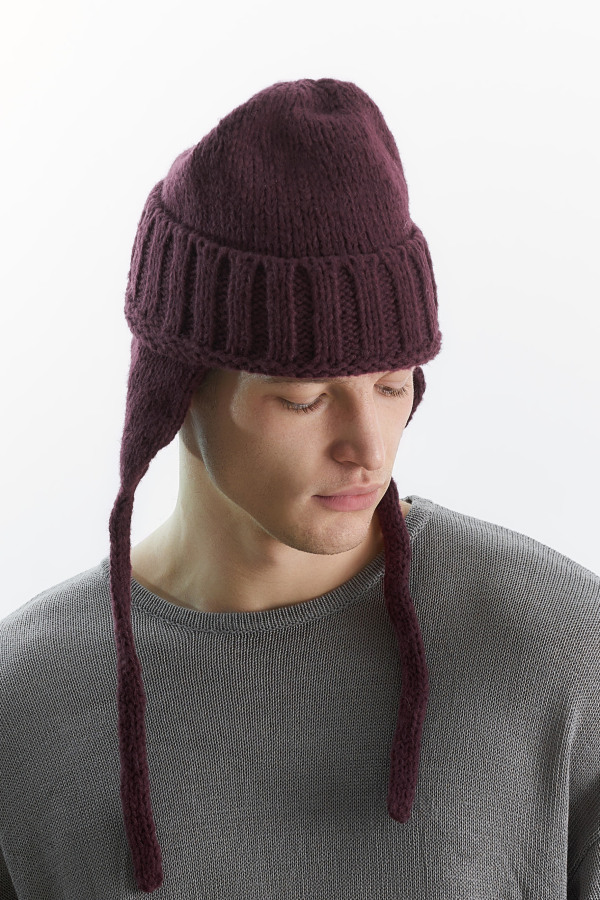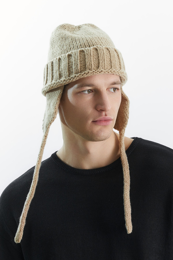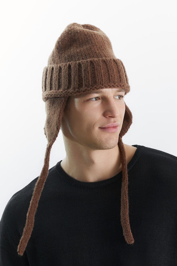Шапка на завязках с утепленными ушами. Выполнена в смешанных техниках плетения. Представлена в бежевом,темно-бежевом, рыжем, бордовым, сером, молочном, коричневом и синем цветах.