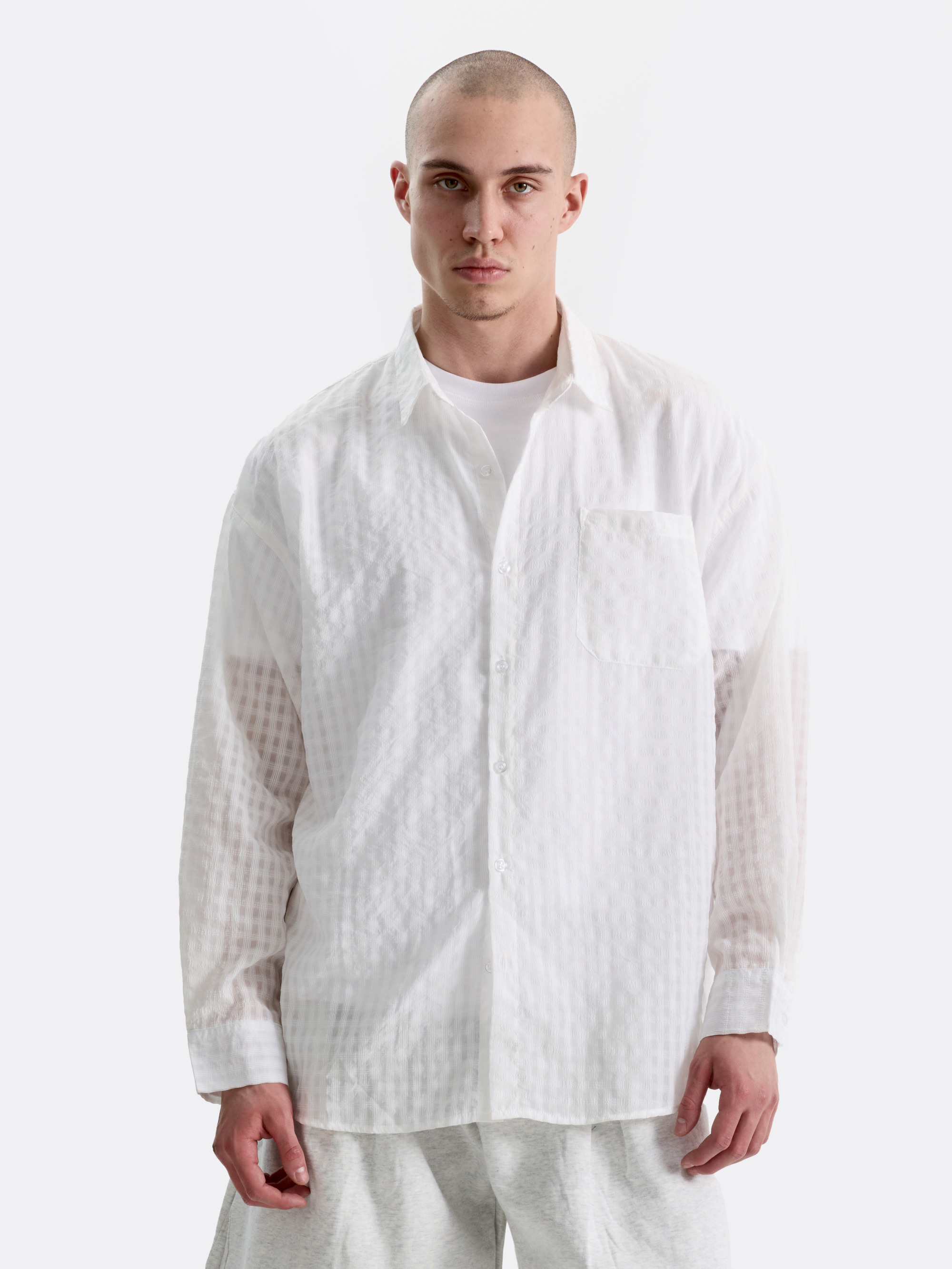 Рубашка Air — это лёгкость в каждом движении. Полупрозрачная текстурированная ткань с вертикальным рисунком делает образ визуально интересным, оставаясь при этом максимально универсальной. Свободный силуэт, накладной карман и классический воротник подчёркивают баланс между повседневностью и эстетикой. Носите на голое тело, в многослойных образах или как лёгкий верхний слой — всегда актуально, всегда легко.