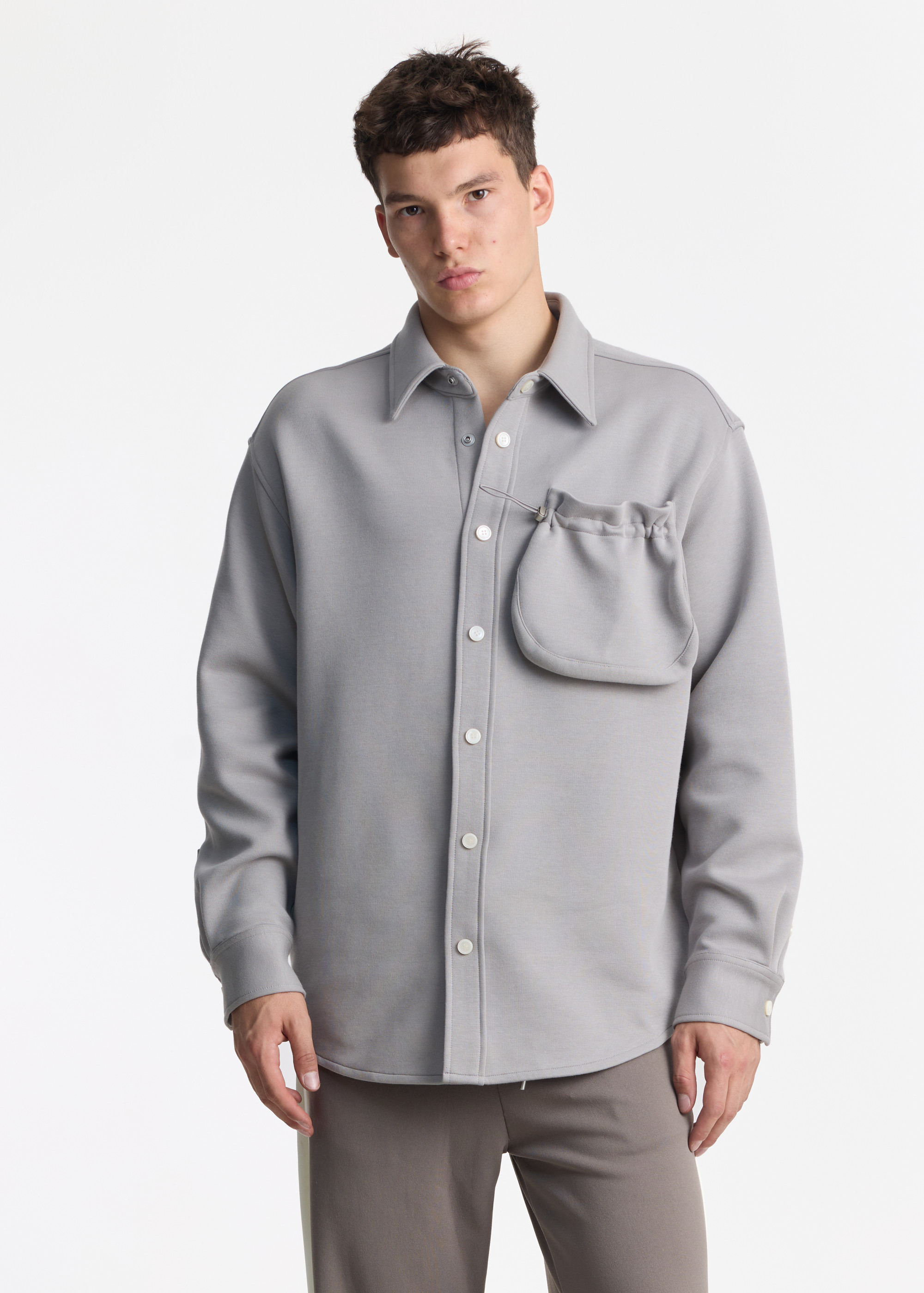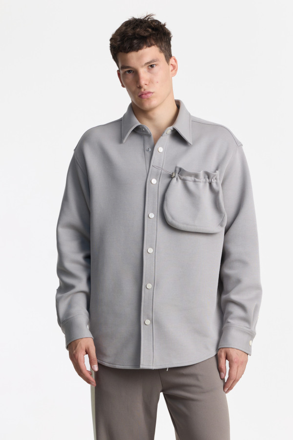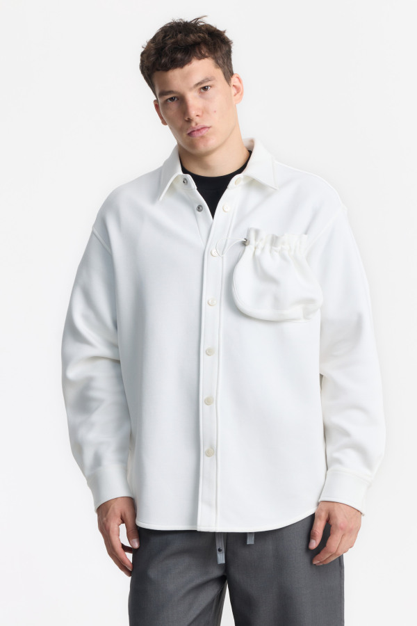 Рубашка с нетривиальной геометрией и технологичной фактурой. Крупный асимметричный накладной карман с утяжкой и декоративной петлёй задаёт тон всему изделию — как будто вещь из параллельной вселенной, где удобство и форма живут на равных.