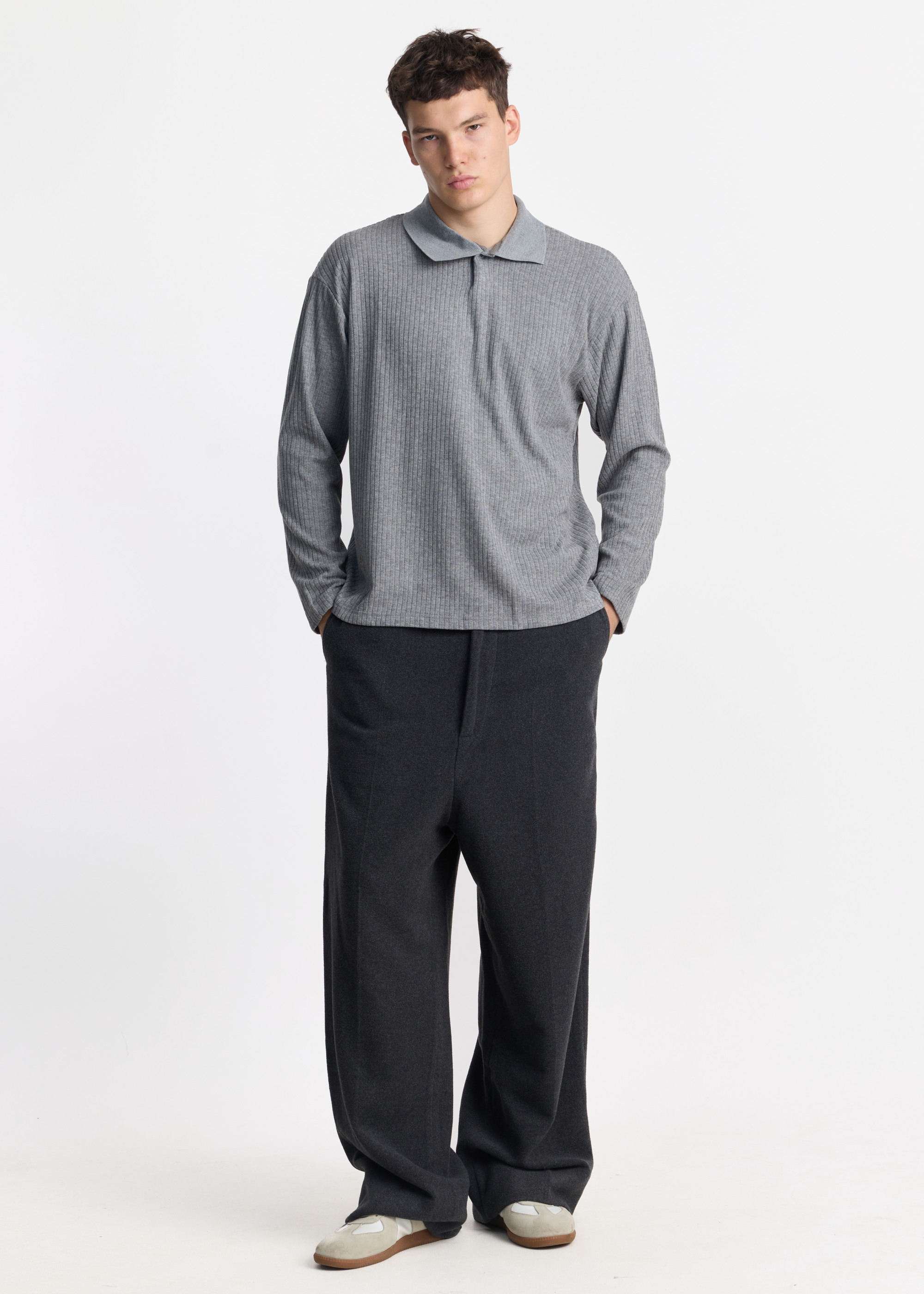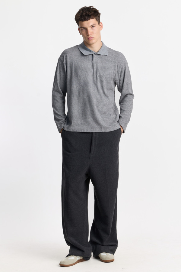 Лонгслив с отложным воротником и потайной застёжкой в тон, выполненный из мягкого ребристого трикотажа. Вертикальная фактура подчёркивает силуэт и визуально вытягивает пропорции. Свободный крой и удлинённые рукава создают расслабленный силуэт с отсылкой к ретро-униформе. Мягкий серый оттенок универсален и нейтрально сочетается с базовыми цветами.