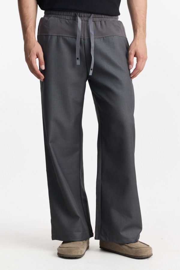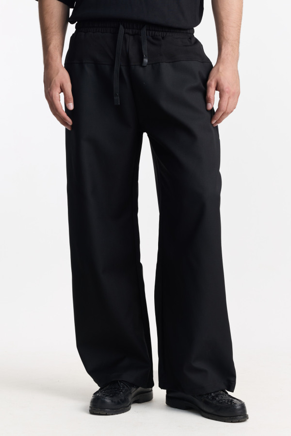 Брюки свободного кроя, сочетающие эстетику классики с деталями спортивной формы. Верхняя часть выполнена из контрастной ткани с регулируемой резинкой и шнурком на поясе. При этом основной объём — из гладкого костюмного материала, сохраняющего строгую геометрию и лёгкий блеск. Сзади — аккуратные накладные карманы. Гибрид, который работает на контрастах и комфорте.