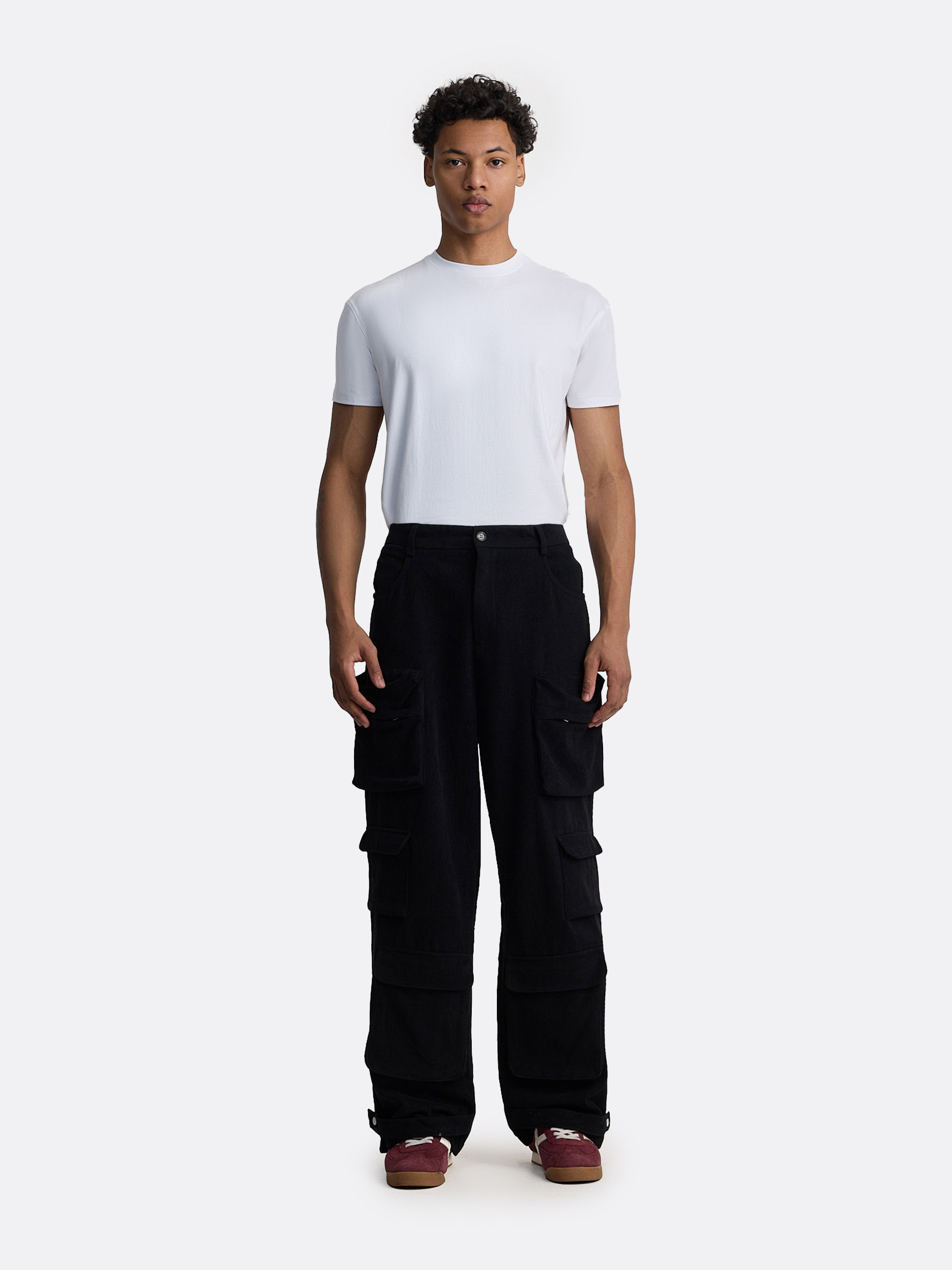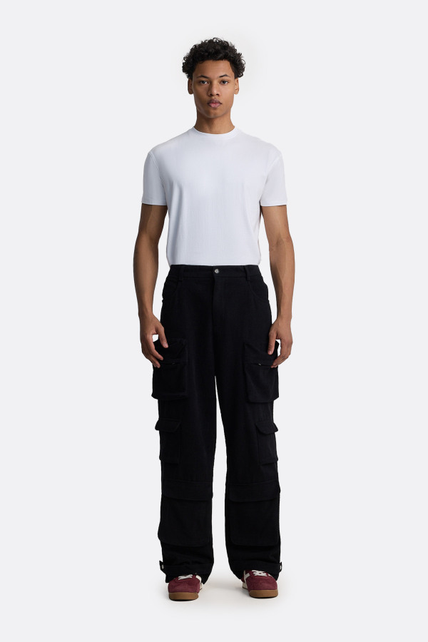 Широкие брюки с утилитарным характером и чёткой геометрией кроя. Основу силуэта формируют крупные накладные карманы с клапанами. Посадка комфортная, с мягкой линией талии и классической застёжкой на пуговицу. Материал плотный и устойчивый, держит форму и подчёркивает объём конструкции. Интерпретация рабочих брюк, с идеальным балансом между практичностью и эстетикой.
