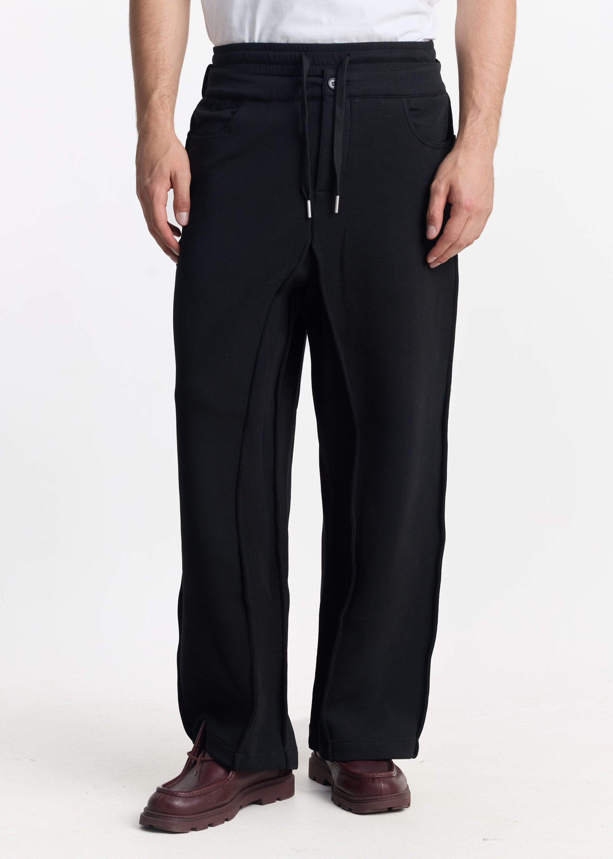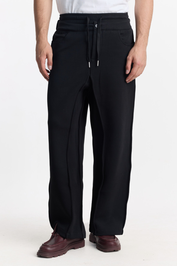 Брюки свободного кроя с характерными внешними швами, которые визуально формируют продольные стрелки. Эластичный пояс с утягивающими шнурками дополнен классической застёжкой на пуговицу. Спереди — два боковых кармана, сзади — накладной. Плотный материал держит форму и подчёркивает фактуру изделия.