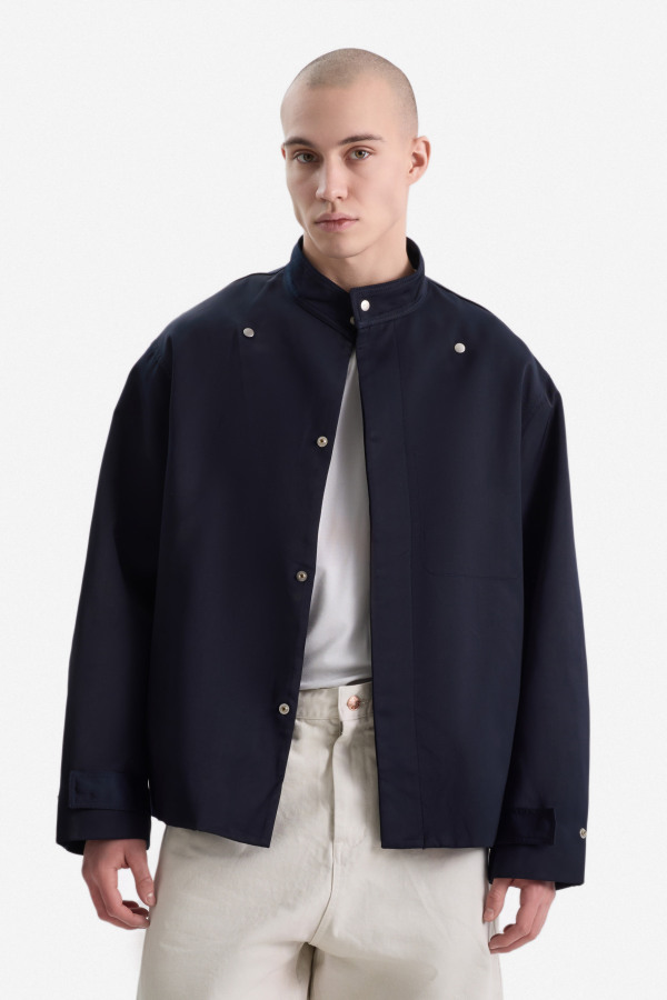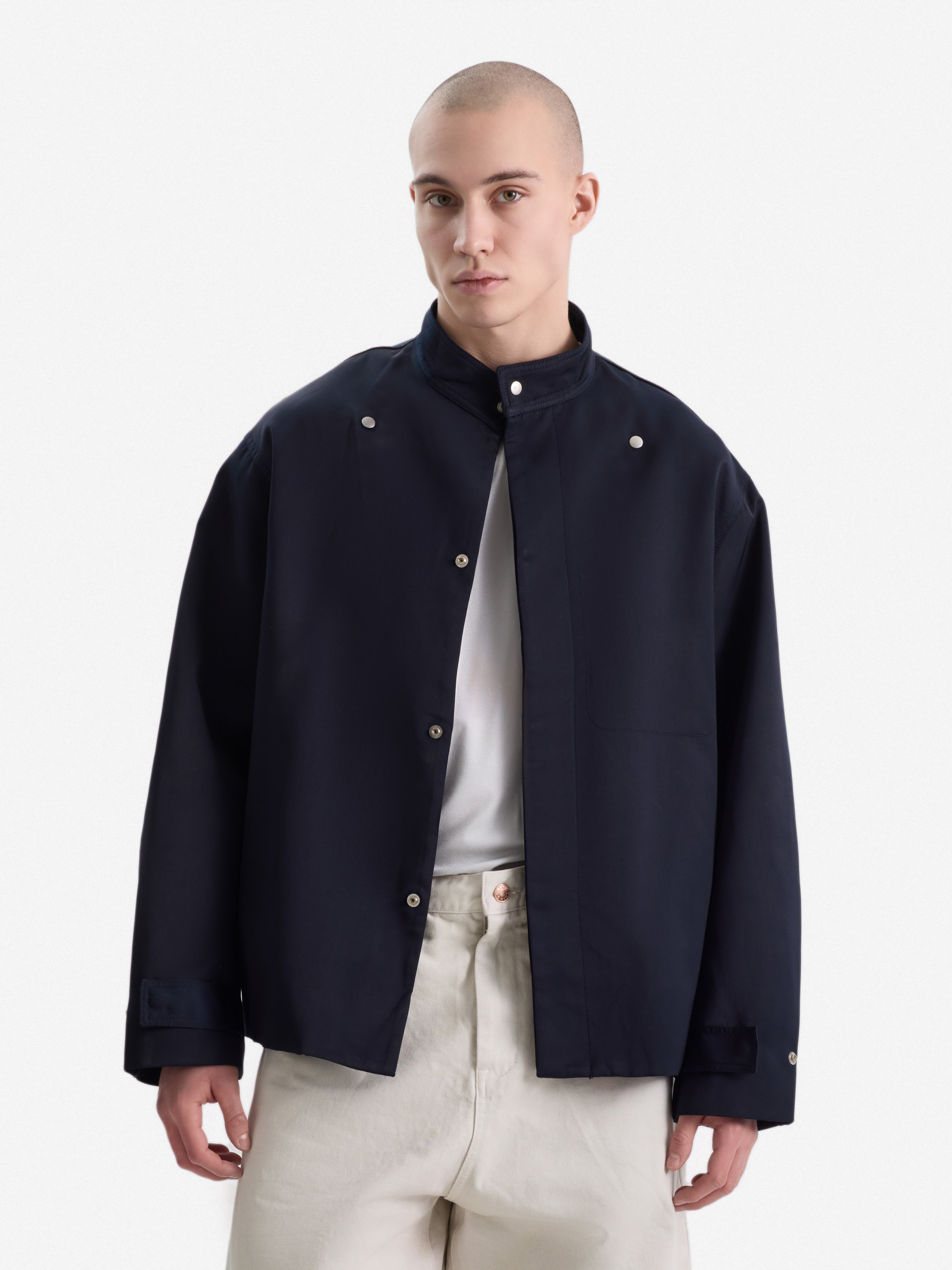 Куртка Midnight Guard – это воплощение минималистичной эстетики с утонченными деталями. Глубокий тёмно-синий оттенок в сочетании с лаконичным кроем придает модели универсальность и стиль. Высокий воротник-стойка с металлическими кнопками добавляет акцент, а свободный силуэт обеспечивает комфортную посадку. Гладкая плотная ткань с легким сатиновым отливом.