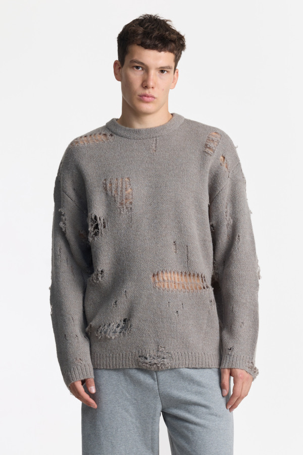 Свитер с характером и следами прошлого. Фактурная вязка и хаотичные прорехи создают эффект состаренного трикотажа — как будто вещь прожила уже не одну историю. Свободный силуэт, мягкая пряжа, «поношенный» серо-земляной оттенок и выраженные потертости на рукавах и груди — всё это превращает SCARS в эмоциональный предмет гардероба.