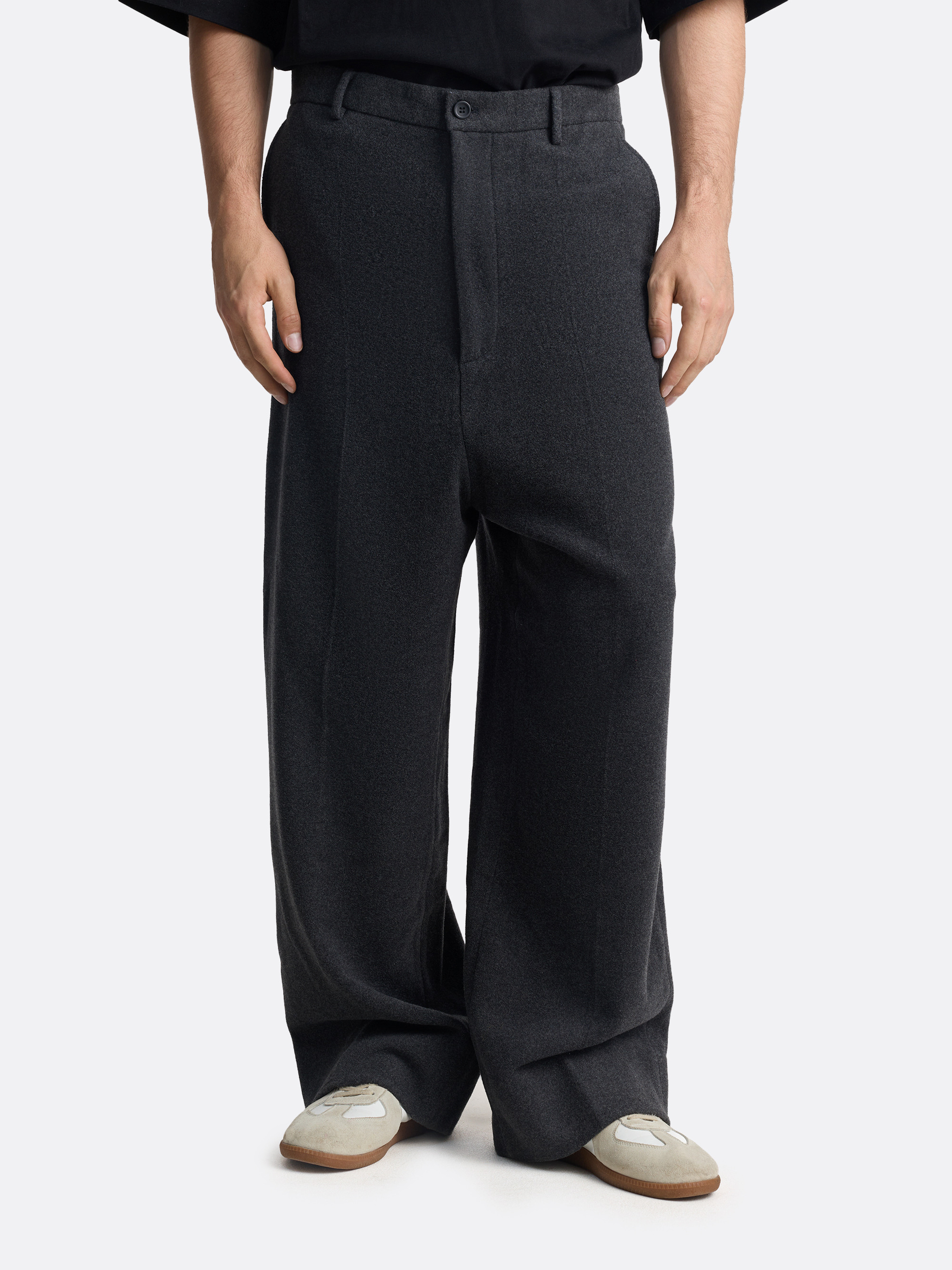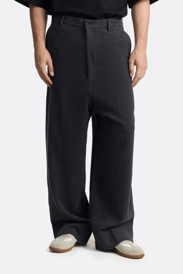 Классические тёмно-серые брюки на основе шерсти с широкой свободной штаниной и мягкой посадкой по талии. Аккуратные стрелки спереди, потайная застёжка на молнии и пуговице, шлёвки под ремень. На спинке — втачной карман с пуговицей. Образец современного переосмысления формального силуэта: минимализм без лишнего, комфорт без компромиссов.