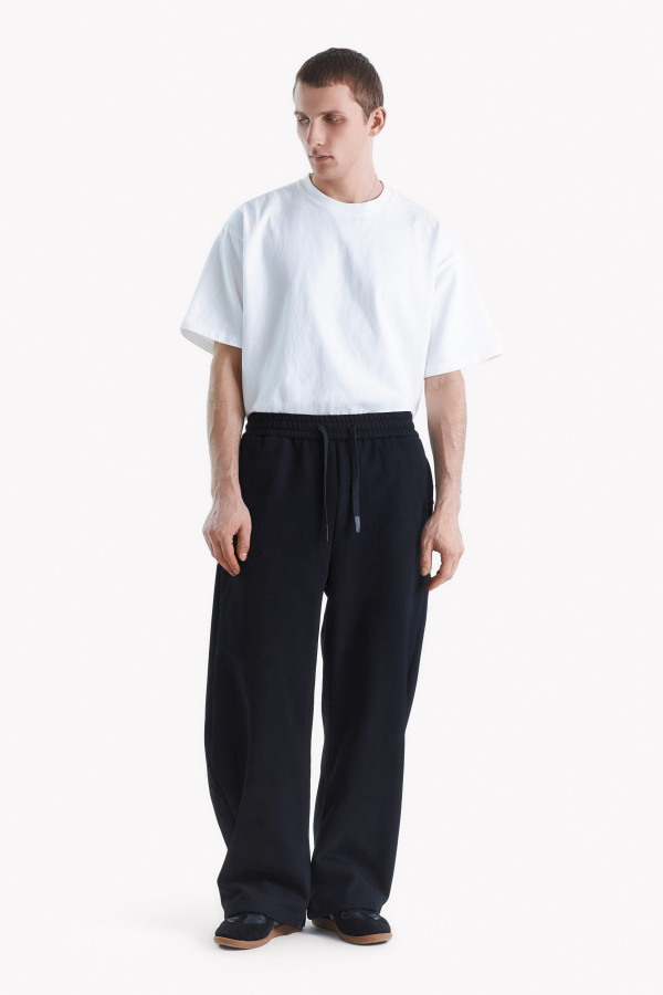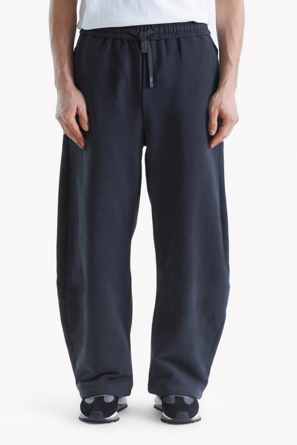 Спортивные брюки прямого кроя. Выполнены из плотного хлопкового утепленного материала, который отлично держит форму и не теряет ее после стирки. Брюки не имеют боковых швов, за счет чего создается интересный прямой силуэт. Имеется кулиска для регулирования объема пояса и боковые карманы. Имеют рваные элементы снизу и на карманах. |