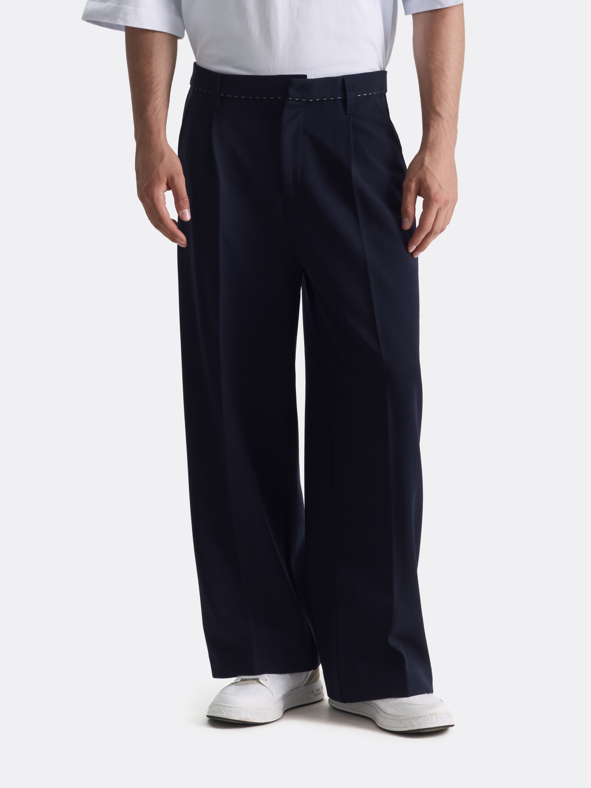 Широкие брюки с акцентной отстрочкой на поясе — деталь, которая сразу привлекает внимание. Посадка комфортная, слегка расслабленная, со стрелками спереди и клапанами на задних карманах. Чёткие линии и выразительная геометрия.