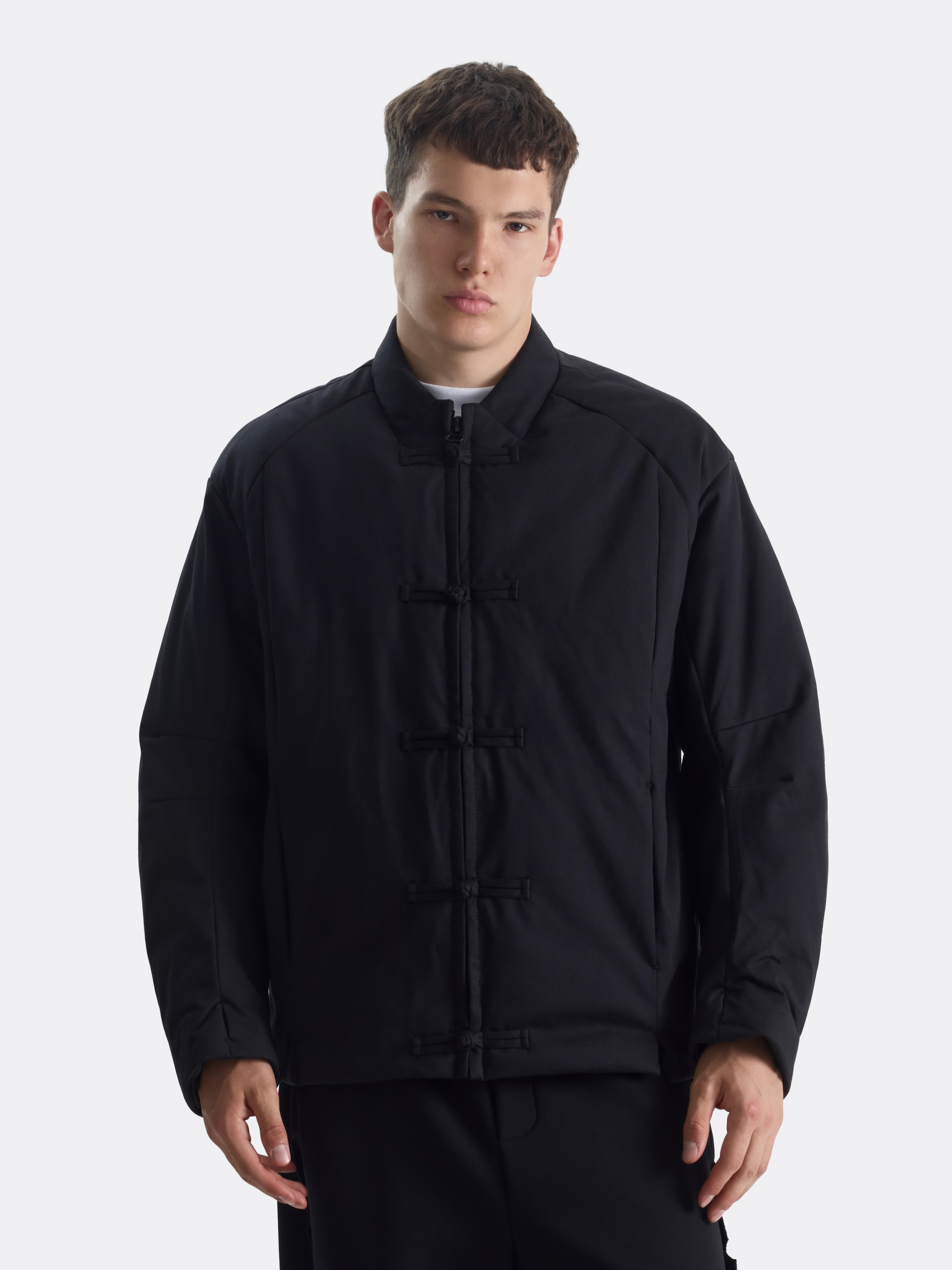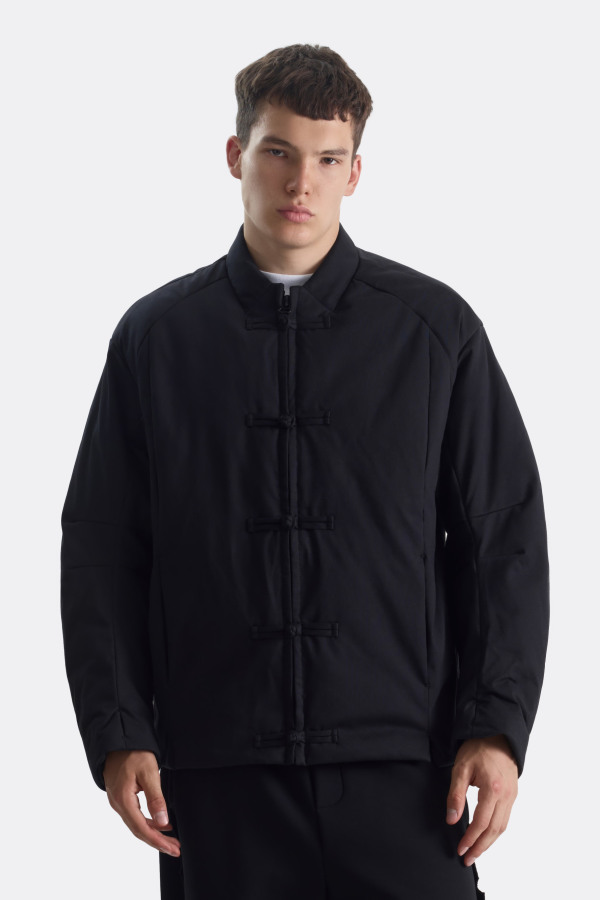 Куртка-кимоно с характерной застёжкой на китайские узлы — переосмысление традиционного силуэта в уличном контексте. Прямой крой, минималистичная геометрия линий, скрытые боковые карманы. Мягкая подкладка и лёгкая утеплённость — на случай переменчивой погоды. Строгий чёрный цвет и подчёркнутая фактурность делают вещь самодостаточной и выразительной.