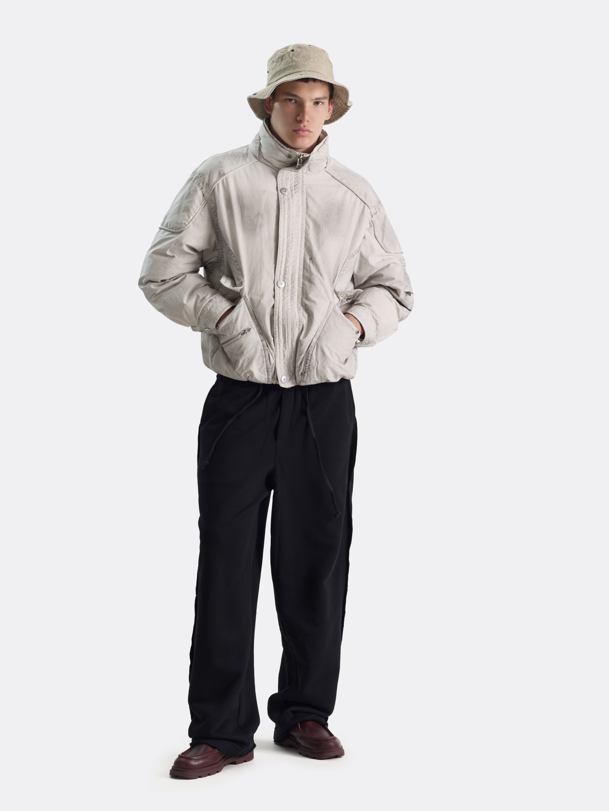 Объёмная куртка-пуховик с налётом индустриальной эстетики. Высокий воротник-стойка и мощная центральная молния с ветрозащитной планкой создают надёжный силуэт. На рукавах — фигурные вставки и декоративные молнии, спереди — объёмные карманы с клапанами и дополнительными молниями. Рукава приспущены, посадка свободная, материал с плотной фактурой и лёгким матовым блеском. Куртка, в которой графичность сочетается с практичностью.