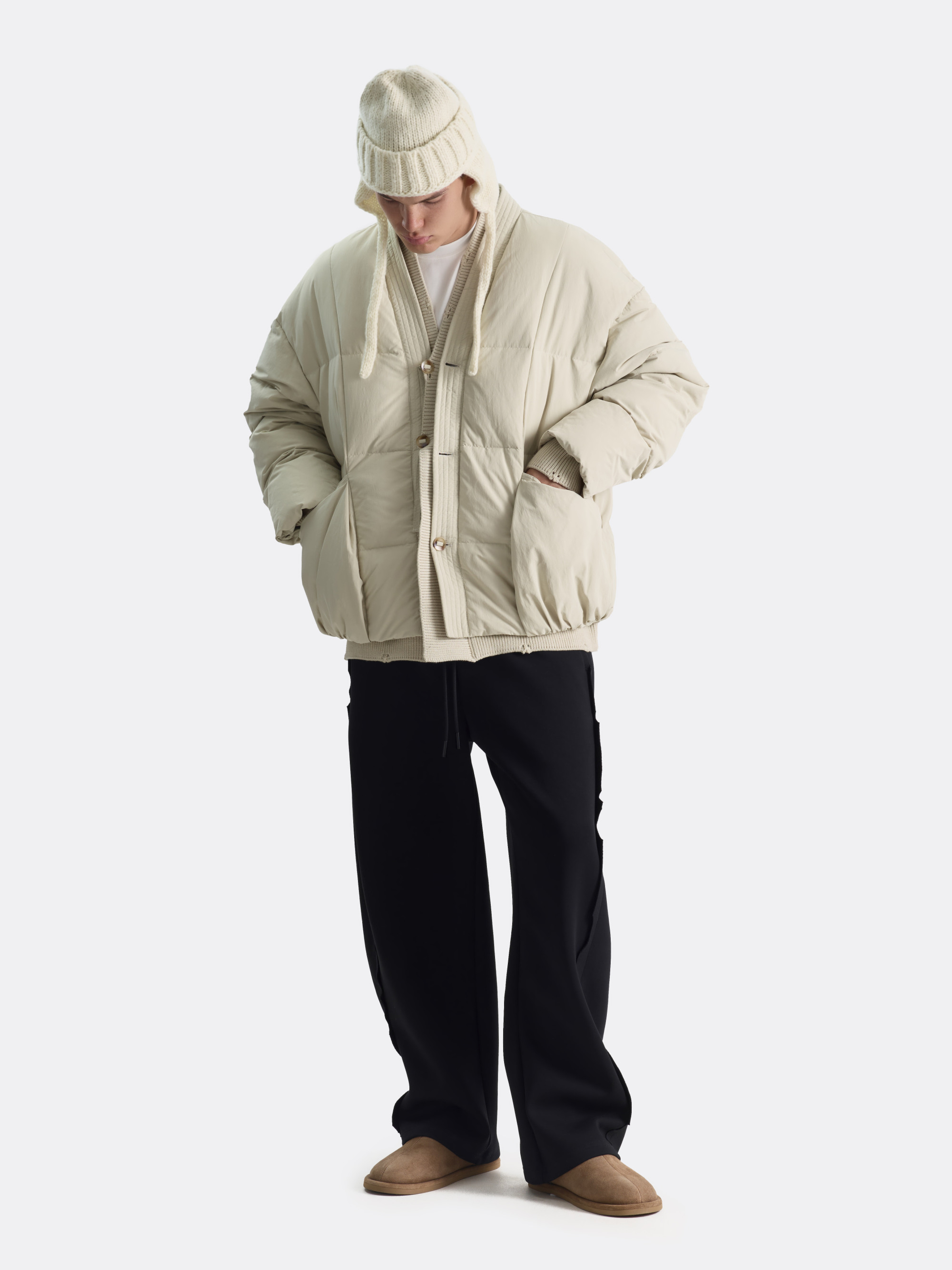 Утеплённая куртка-кимоно с акцентом на уют и объем. Мягкая и воздушная, будто вдохновлённая формой японского хаори, но адаптированная к зимнему холоду. Широкая горловина переходит в фактурную планку на пуговицах, подчёркивая необычную конструкцию модели. Низ, манжеты и внутренняя часть воротника выполнены из плотной резинки, создавая многослойный эффект. Слегка приспущенные плечи и объёмный силуэт добавляют расслабленности.