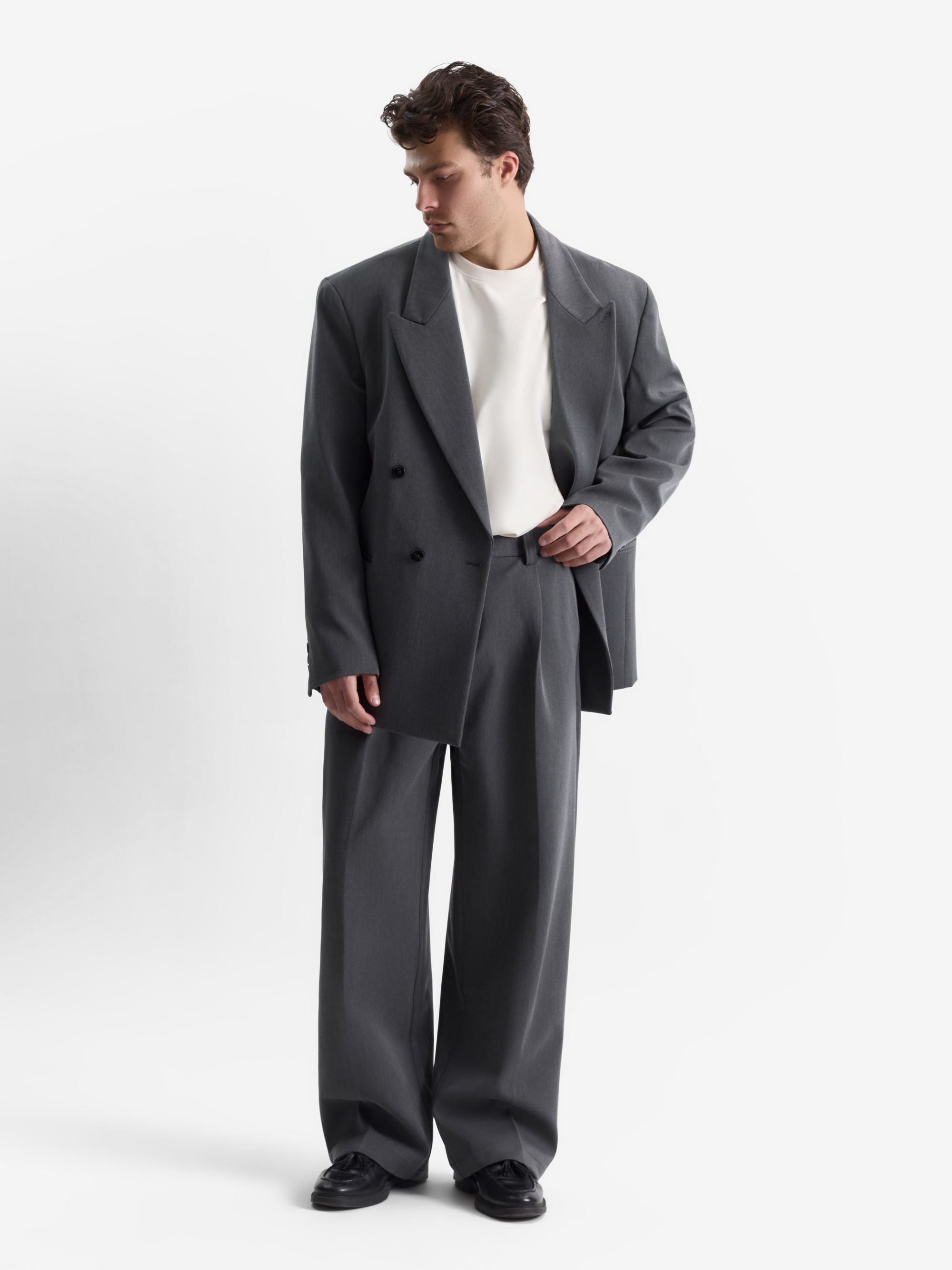 Пиджак Steel Form — это современная интерпретация классики с выраженной архитектурностью. Чёткие линии, двойная застёжка и заострённые лацканы подчёркивают силу и элегантность силуэта. Глубокий серый оттенок придаёт модели универсальность и сдержанную харизму. Удлинённый фасон и акцентированные плечи создают эффектную посадку, которая одинаково уместна как в формальных образах, так и в сочетаниях с кэжуал-элементами.