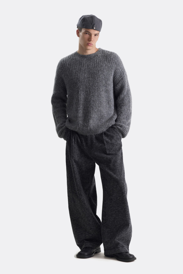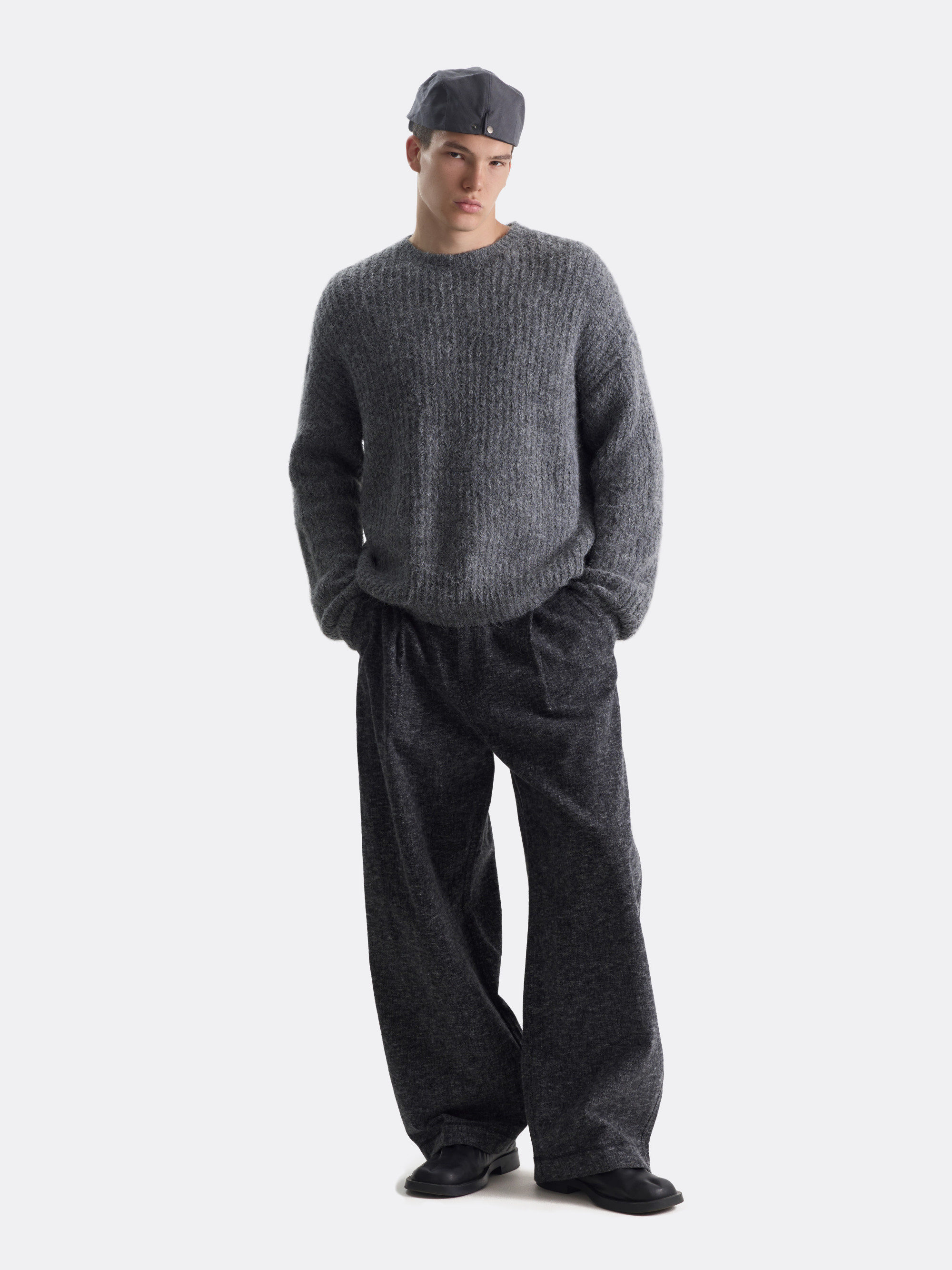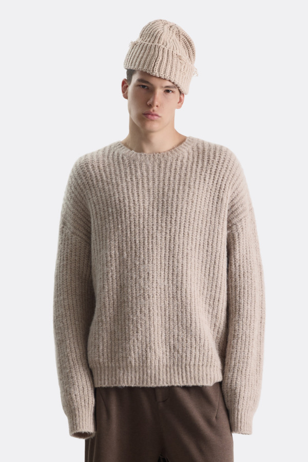 Объёмный свитер с выраженной текстурной вязкой в вертикальный рубчик на основе шерсти. Мягкий ворс создаёт уютную, чуть винтажную фактуру — будто свитер уже прожил несколько зим и сохранил в себе тепло всех прошлых сезонов. Свободный крой, спущенная линия плеча и широкие рукава усиливают расслабленное настроение. Слегка удлинённые манжеты и плотная резинка по низу делают посадку собранной, но не стеснённой.