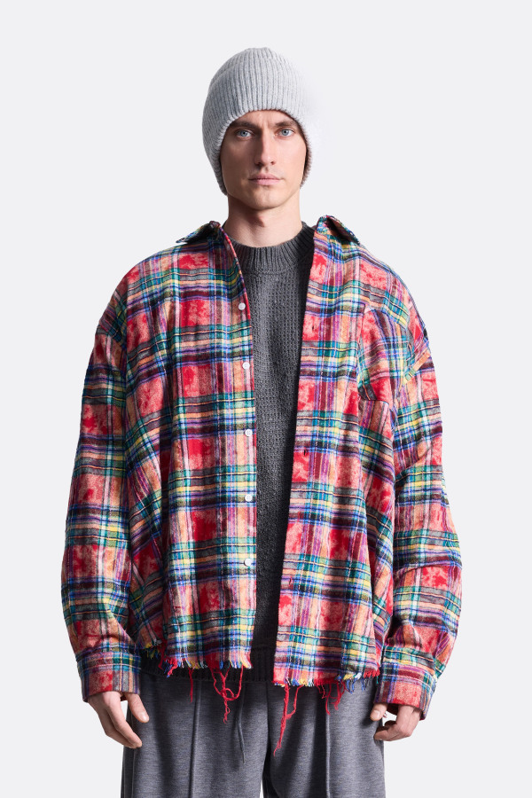 Клетчатая рубашка оверсайз-кроя с рваными краями снизу - наш бестселлер. Выполнена из плотного и при этом мягкого хлопка. Имеет по складке на кокетке с каждой стороны. Дополнена функциональным нагрудным карманом. Застежка на пуговицах с имитацией перламутра. Рубашка представлена в красном и бордовом цветах.