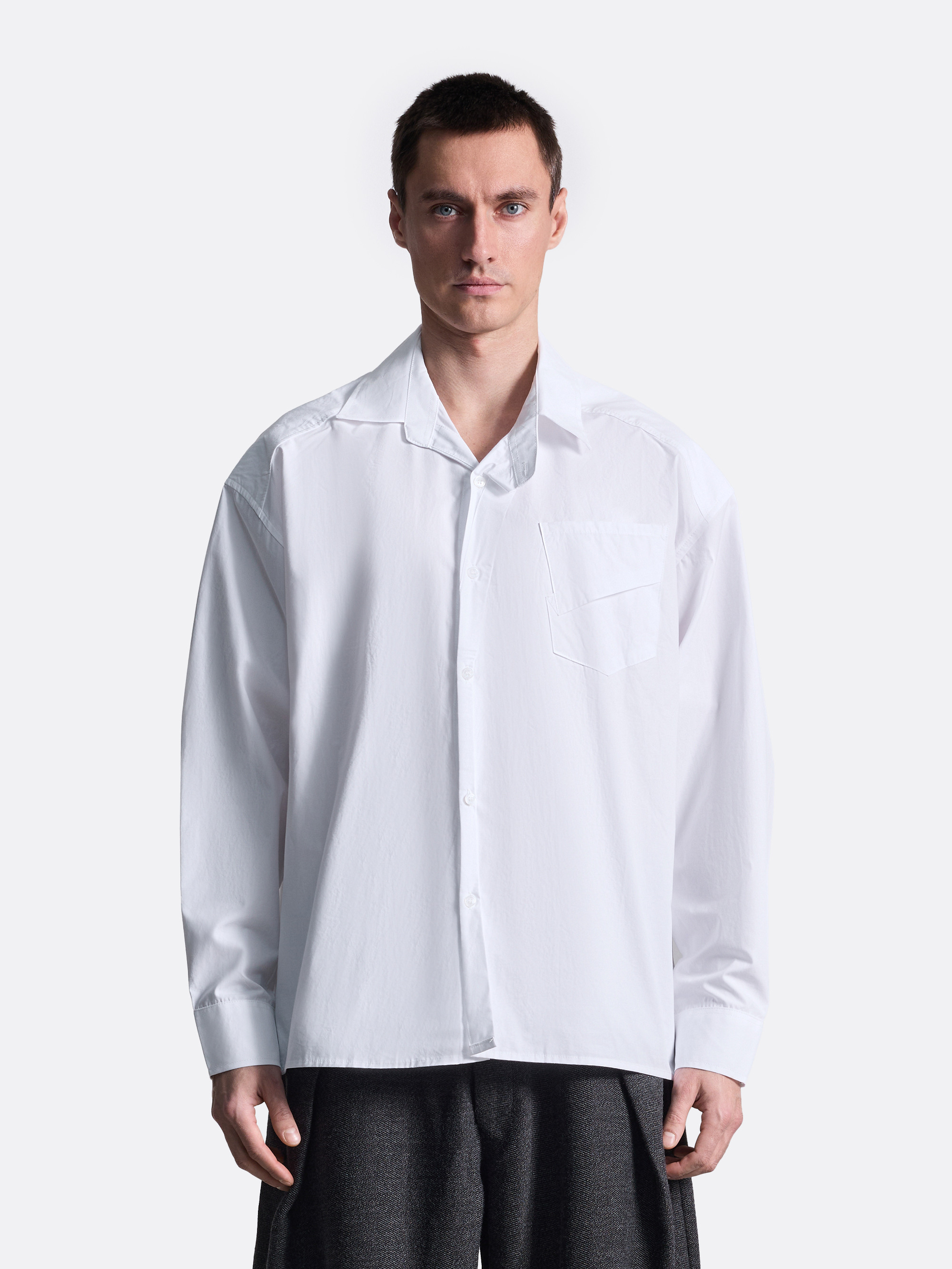 Рубашка с ассиметричной стежкой. Классический дизайн с отложным воротником, застёжкой на пуговицах и накладным двойным карманом на груди. Практичная и стильная — подойдёт как для повседневного образа, так и для более формального стиля.