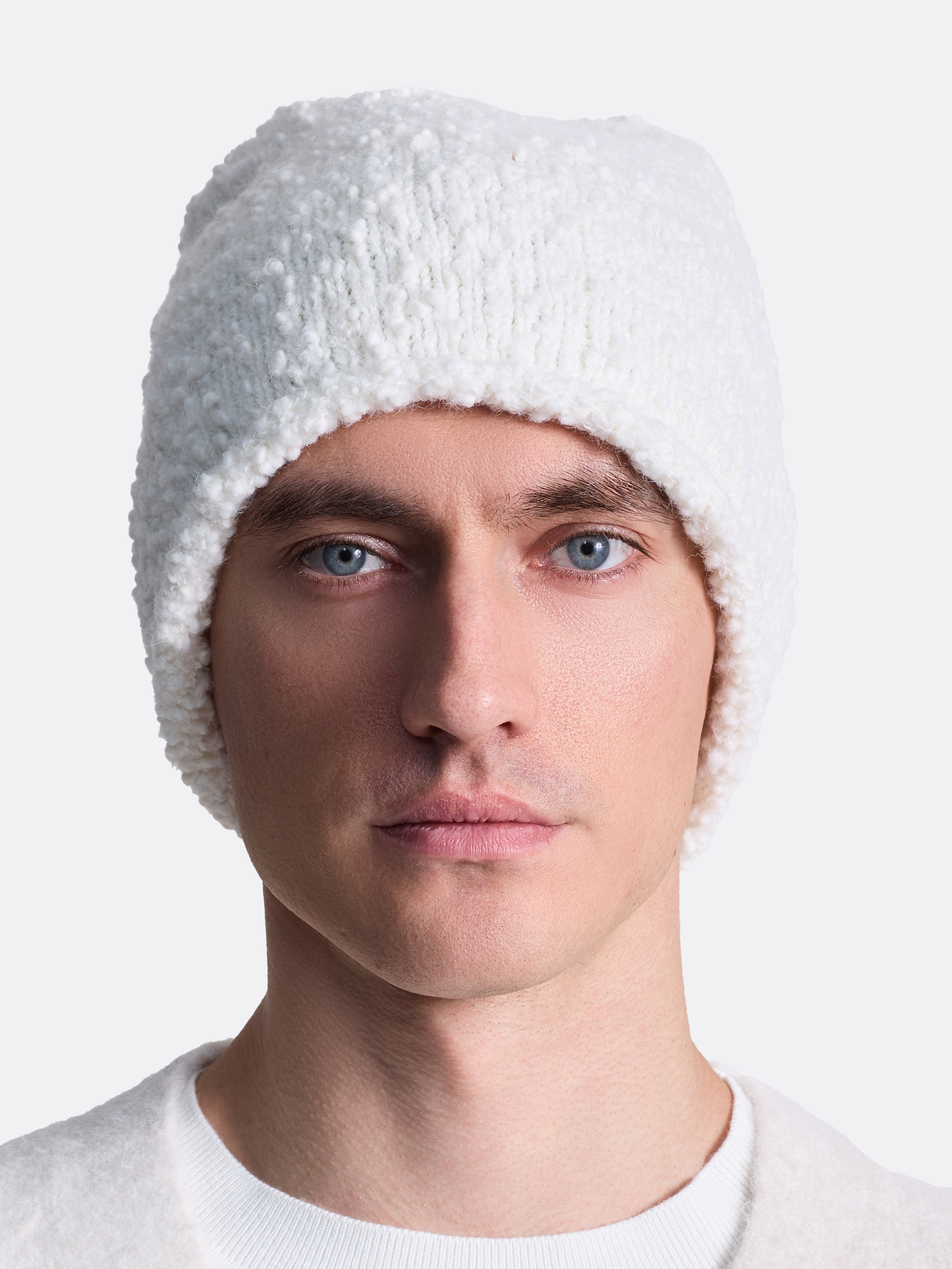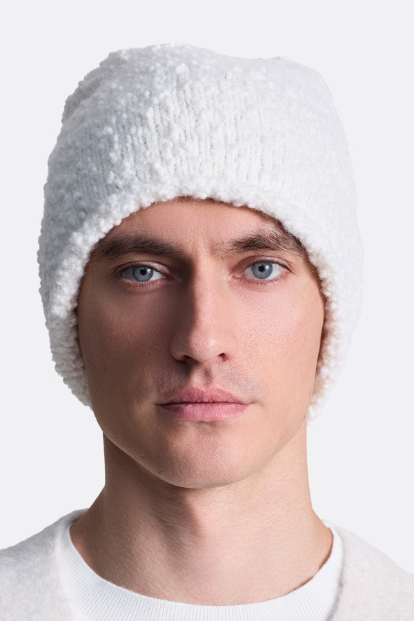 Вязаная шапка с объёмной фактурой. Особенность модели — слегка небрежный, «свободный» крой с наслоением. Мягкая пряжа обеспечивает комфорт при носке и отличную термоизоляцию, идеально подходящую для прохладной погоды. Шапка представлена в бежевом, молочном и черном цветах.