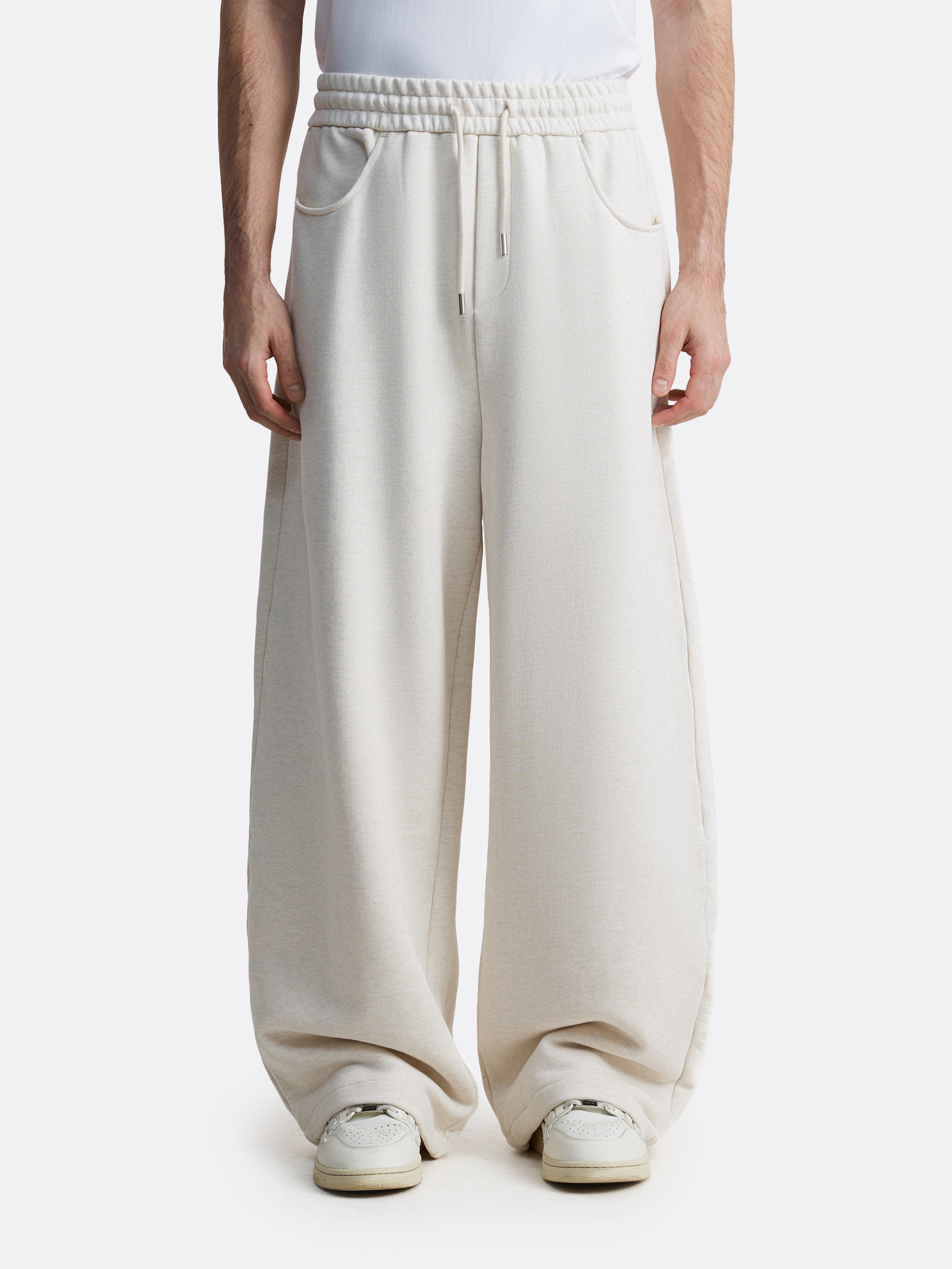 Свободные утепленные брюки из плотного трикотажа. Глубокая посадка, эластичный пояс на кулиске и объёмный прямой силуэт, создавая характерную тяжёлую драпировку. Передние карманы округлой формы, сзади — один накладной карман.