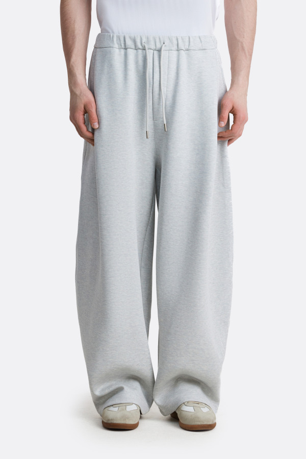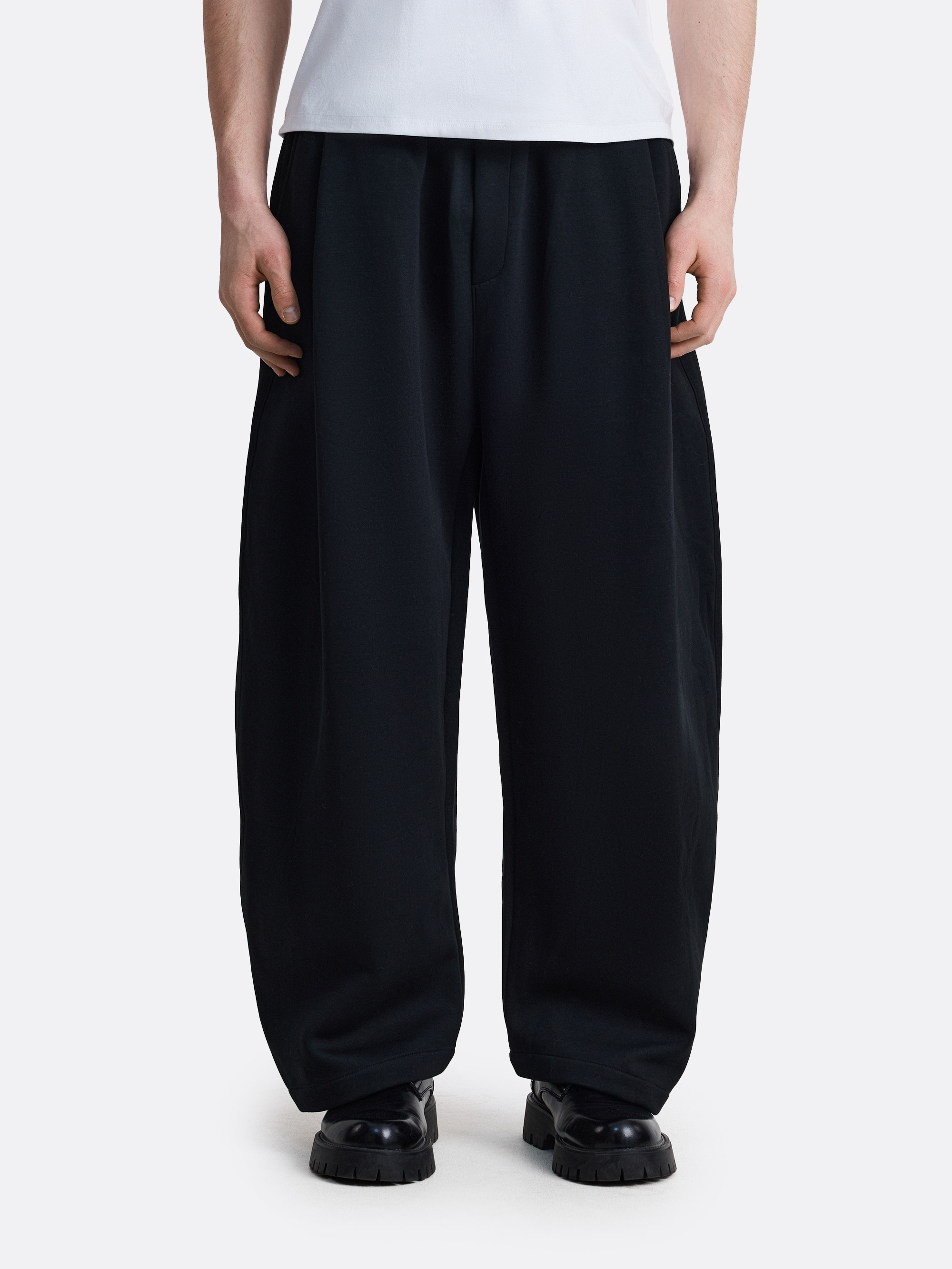 Свободные брюки с выразительным объёмом и мягкой посадкой, которые держат баланс между расслабленным силуэтом и аккуратной конструкцией. Эластичный пояс со шнурком, округлые линии по бокам, один задний карман и лёгкая фактура материала — всё собрано так, чтобы брюки двигались за телом и давали комфорт без ощущения тяжести. Силуэт плавно уходит к низу, создавая фирменный дрейфующий контур.