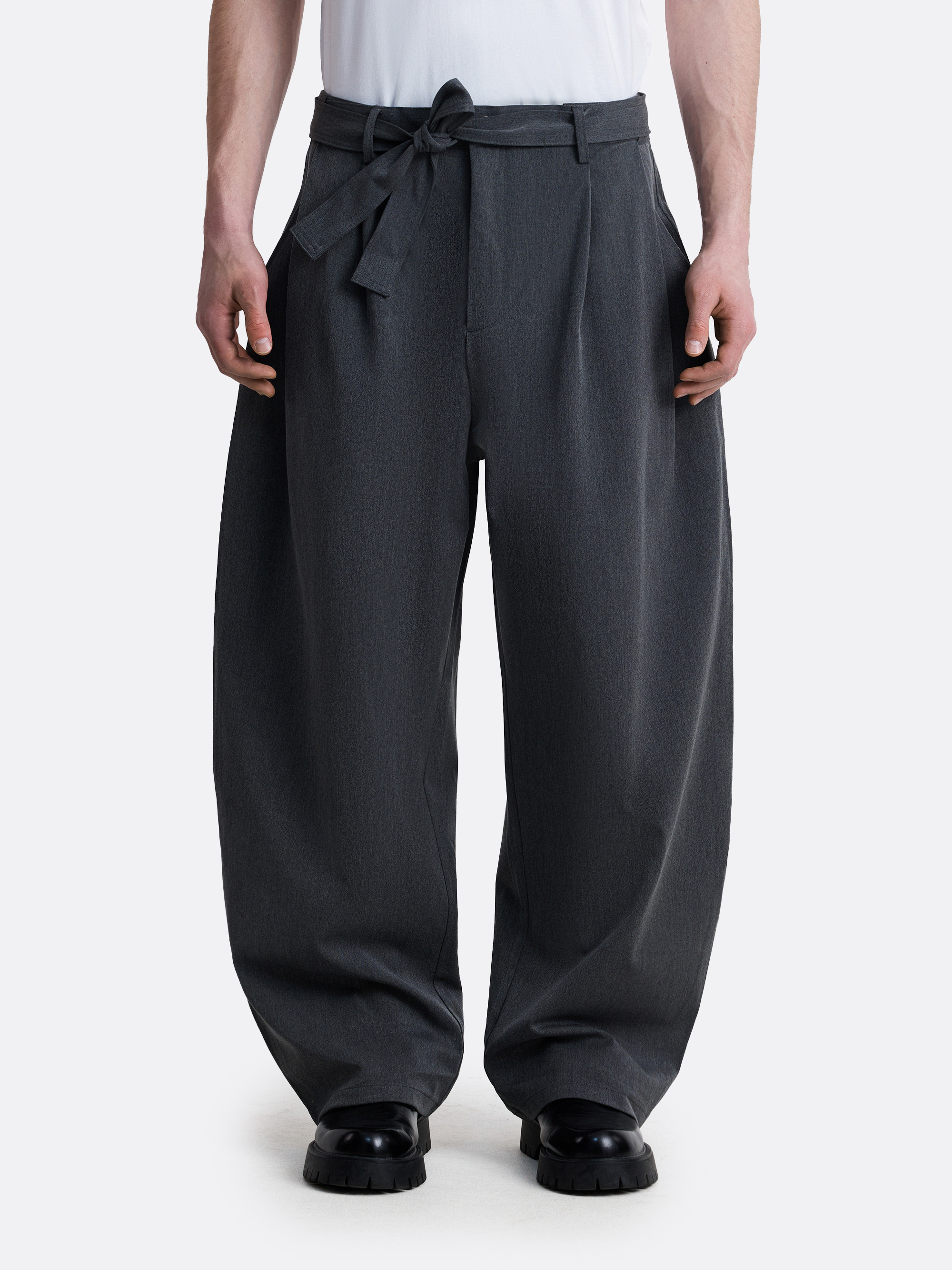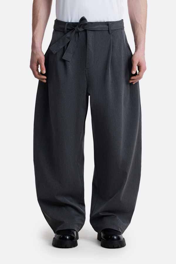 Объёмные брюки с мягкой, свободной посадкой и широкими брючинами, создающими характерный силуэт. Пояс дополнен текстильным ремнём-лентой — акцентная деталь, добавляющая образу динамику и лёгкий восточный штрих. Гладкая ткань ложится ровными плоскостями, подчёркивая чистую архитектуру кроя и выразительную линию драпировки.