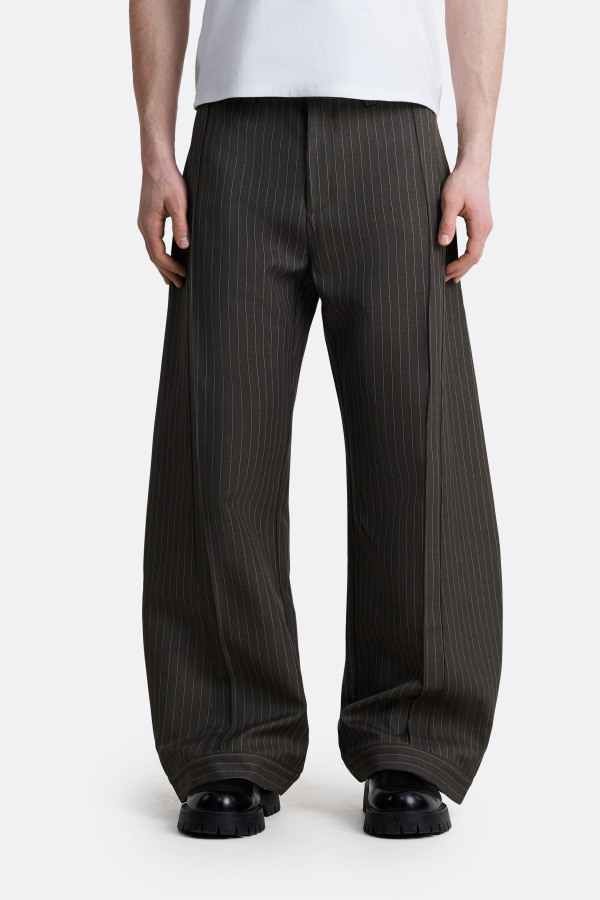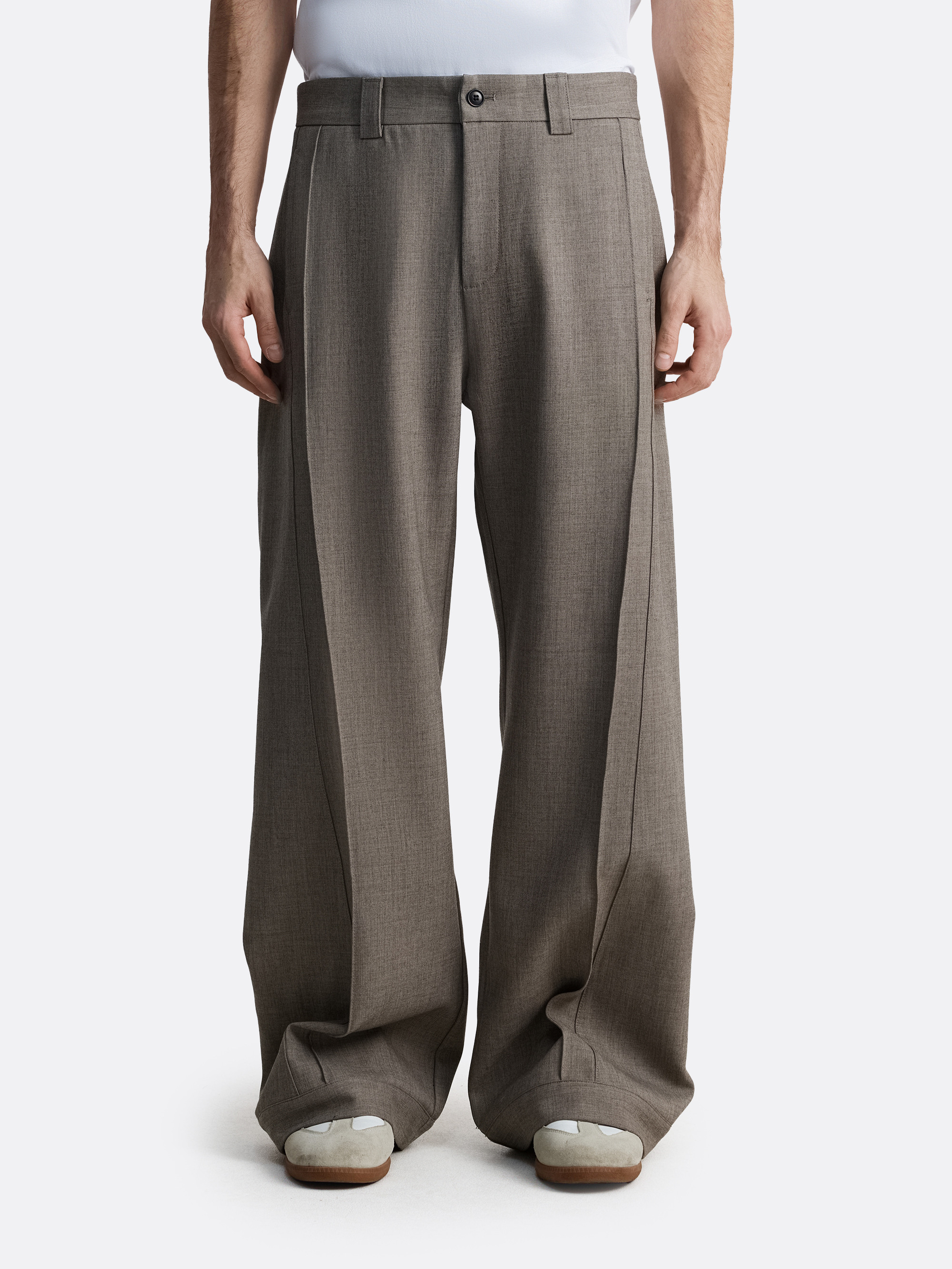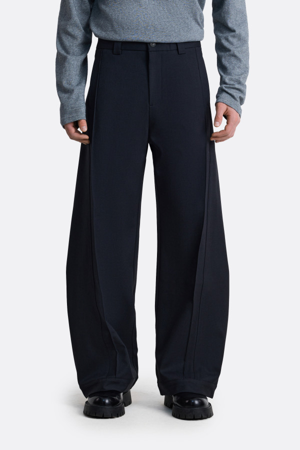 Свободные брюки с плавной, расслабленной посадкой и выраженной линией стрелок. Мягкая ткань с добавлением шерсти формирует естественный драп и подчёркивает объёмный силуэт. Пояс со шлёвками, аккуратная застёжка на пуговицу и продуманные детали кроя задают чистый, современный ритм.