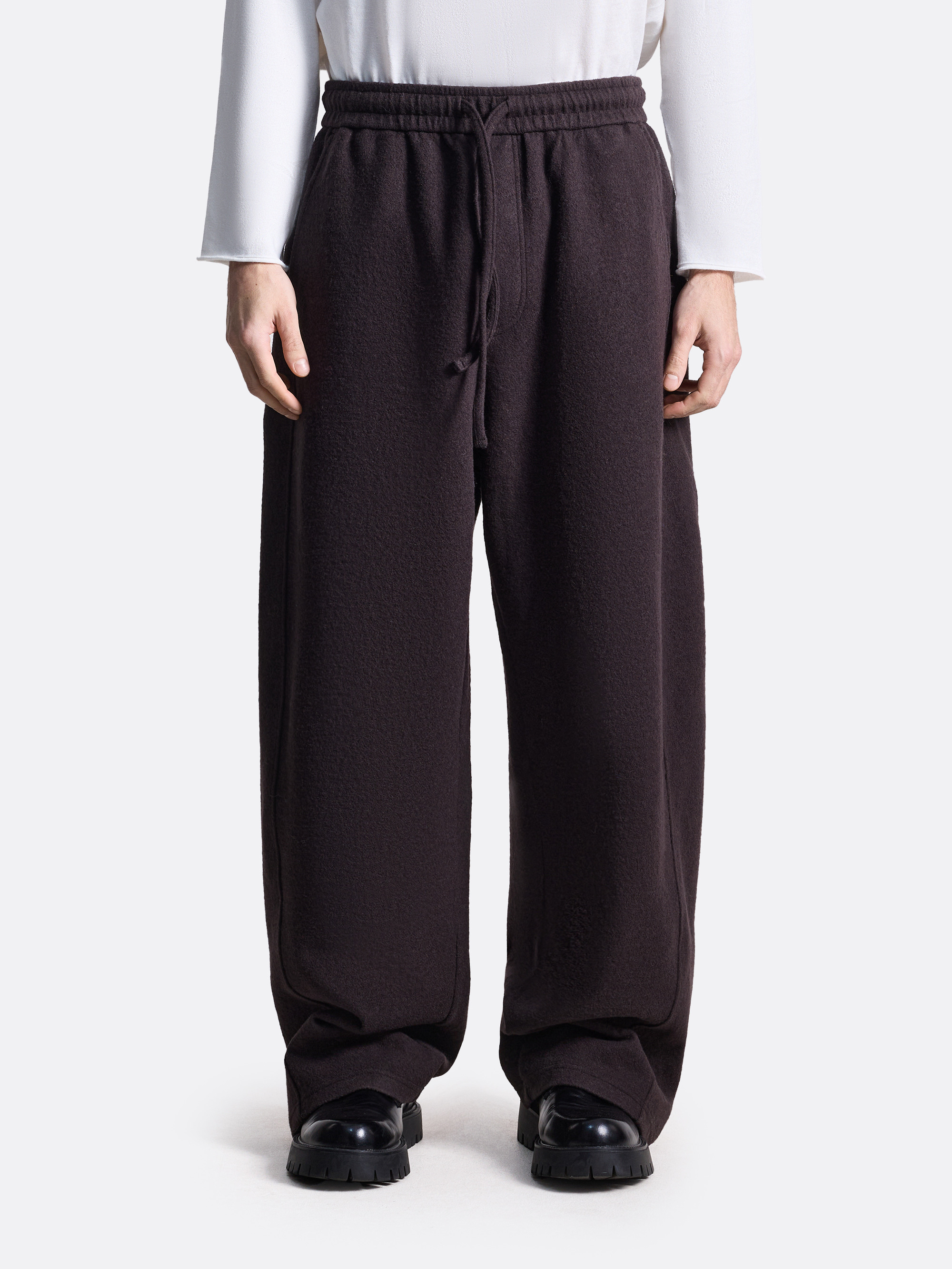 Свободные брюки, выполненные из приятного на ощупь материала на основе шерсти с лёгким ворсом. Прямой объёмный силуэт создаёт расслабленную вертикаль, а эластичный пояс добавляет комфорта и естественной посадки. Аккуратный шов вдоль штанины визуально вытягивает линию и делает образ чище. Лёгкость, тепло и минимализм — спокойная база для осенних и зимних образов.