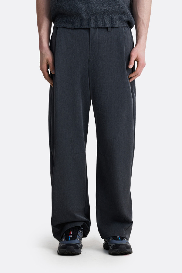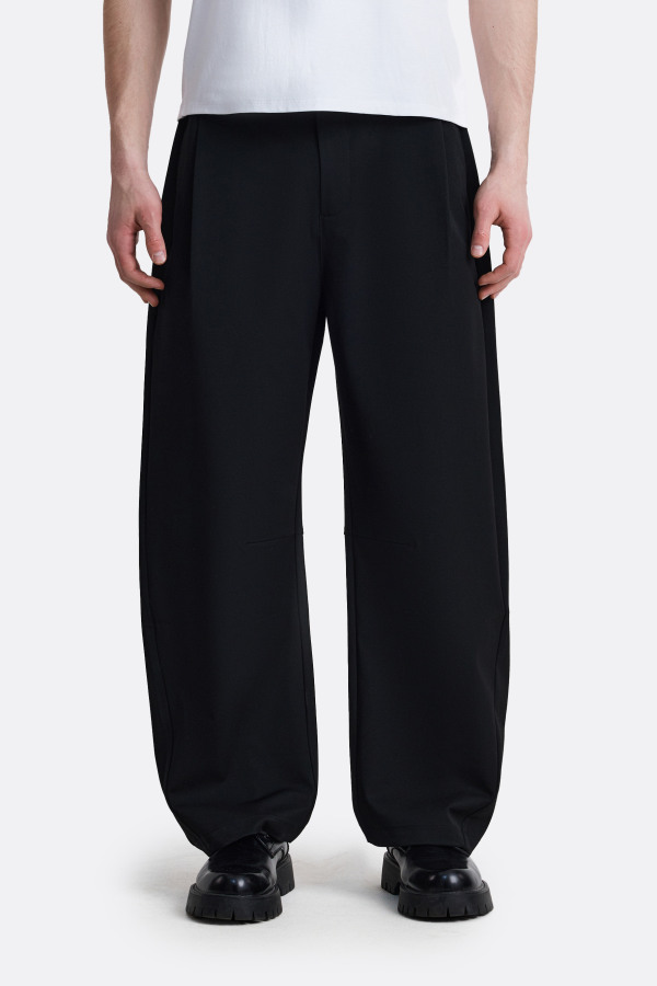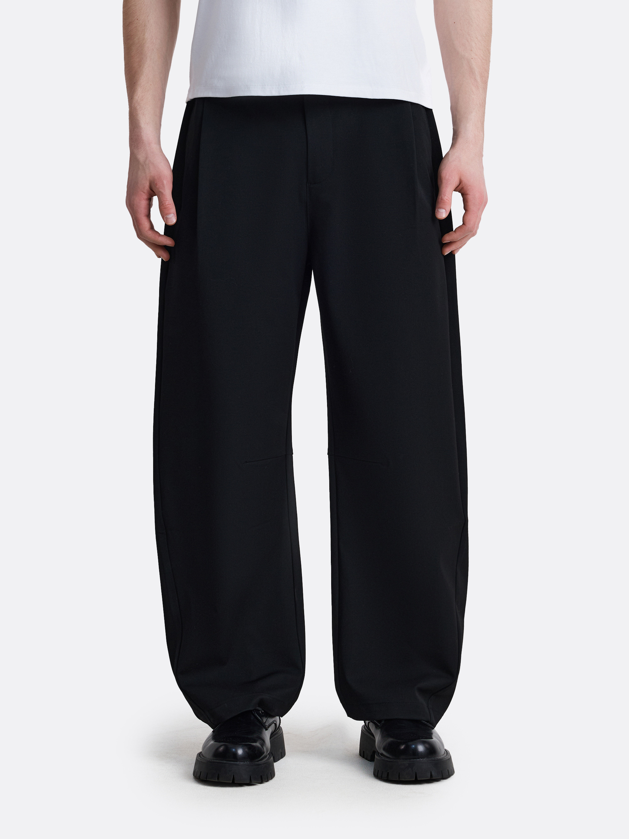 Широкие брюки из гладкой костюмной ткани с чистой линией посадки и минималистичными вытачками, создающими аккуратный объём. Плотный пояс без лишних деталей делает силуэт собранным, а мягкое расширение к низу — спокойным и современным. Лаконичная модель, которая работает и в повседневных образах, и в более строгих сочетаниях.