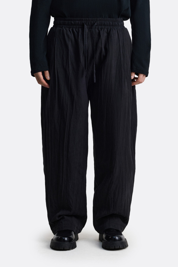 Широкие утепленные брюки с фактурой «смятой» ткани и глубокой посадкой. Эластичный пояс с регулируемым шнурком, мягкий прямой силуэт и характерные вертикальные заломы, которые создают ощущение движения даже в статике. Ткань драпируется свободно и естественно, образуя живую, неровную поверхность — спокойный минимализм с намёком на японскую эстетику.