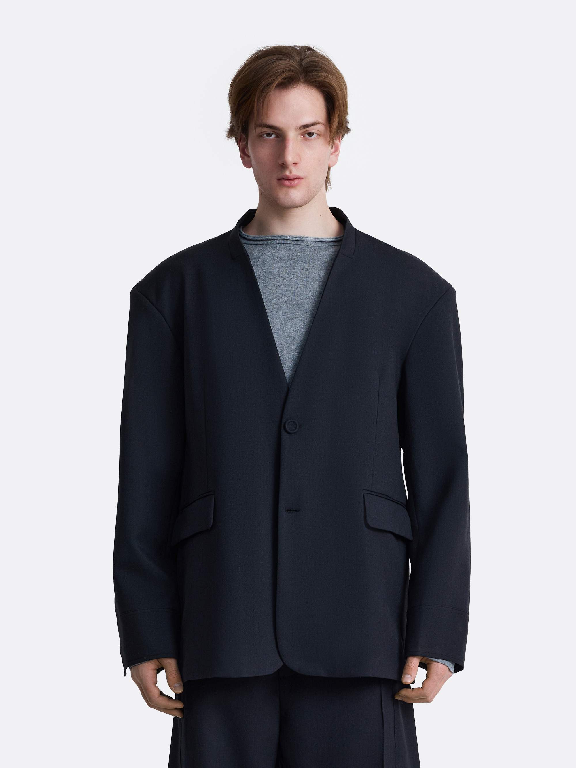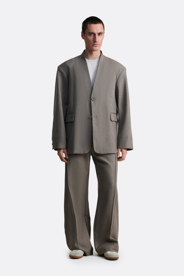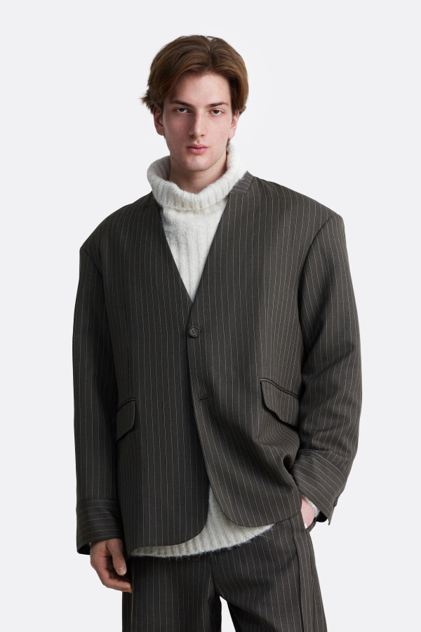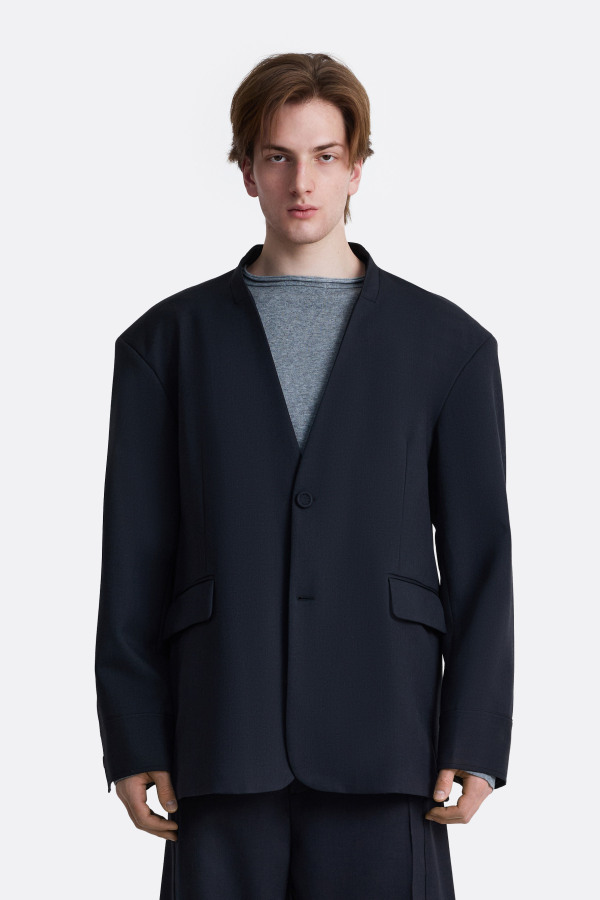 Пиджак с плавно скроенной линией плеч и мягкой посадкой, создающий современный силуэт без излишней формальности. Минималистичная горловина без лацканов визуально вытягивает линию корпуса, а одинарная застёжка подчёркивает чистую геометрию переда. Фактура ткани лёгкая и пластичная, благодаря чему пиджак держит форму, но остаётся расслабленным в движении. Карманы с клапанами добавляют аккуратный акцент, а общий образ — ту самую интеллектуальную простоту.