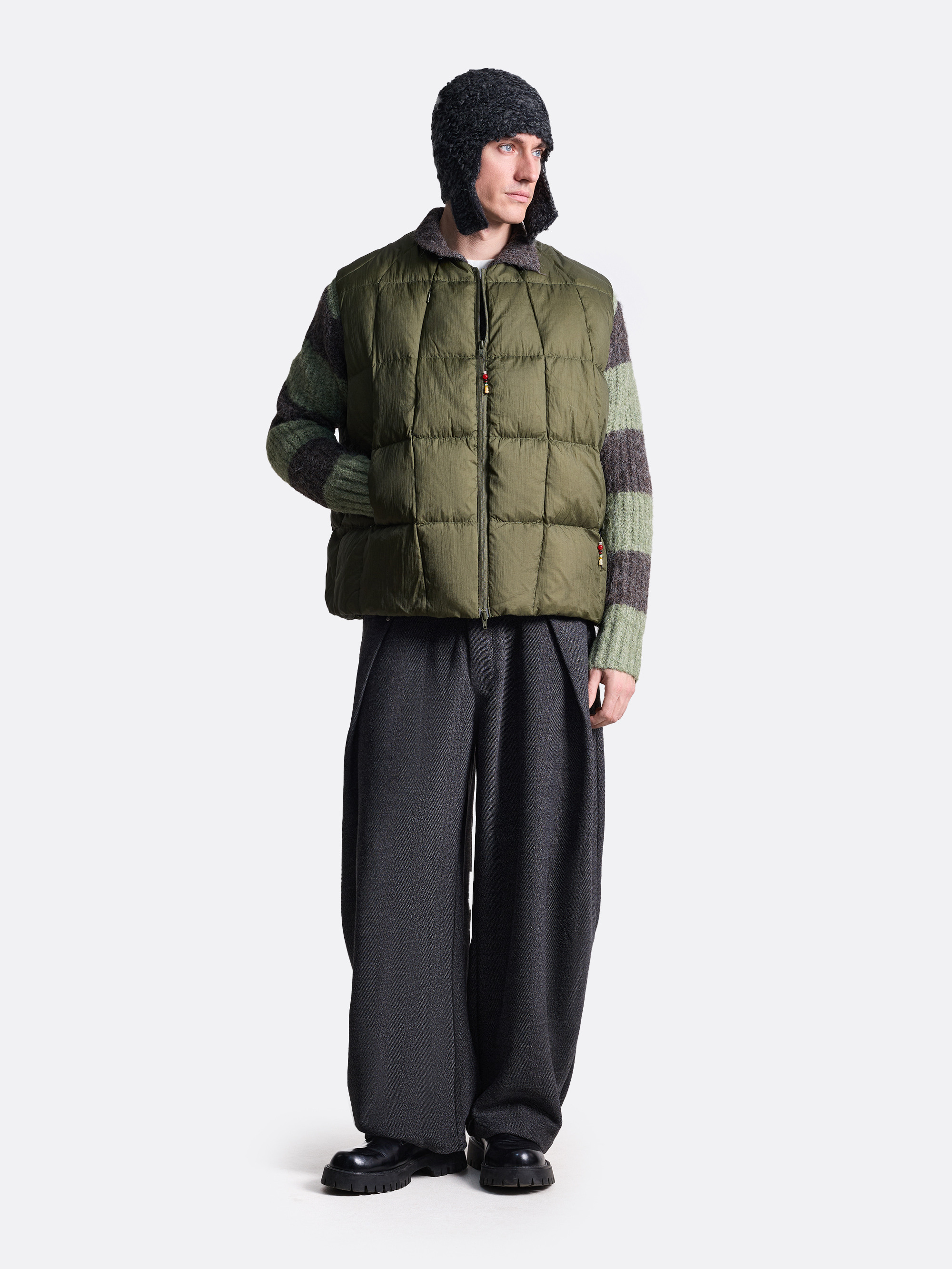 Стёганый жилет выполнен из лёгкого нейлона с подкладом, который отлично сохраняет тепло, не утяжеляя образ. Изделие укороченного кроя, без воротника. Застёжка-молния дополнена декоративными цветными бусинами. Жилет представлен в черном и хаки цветах.