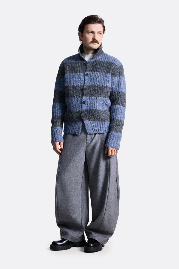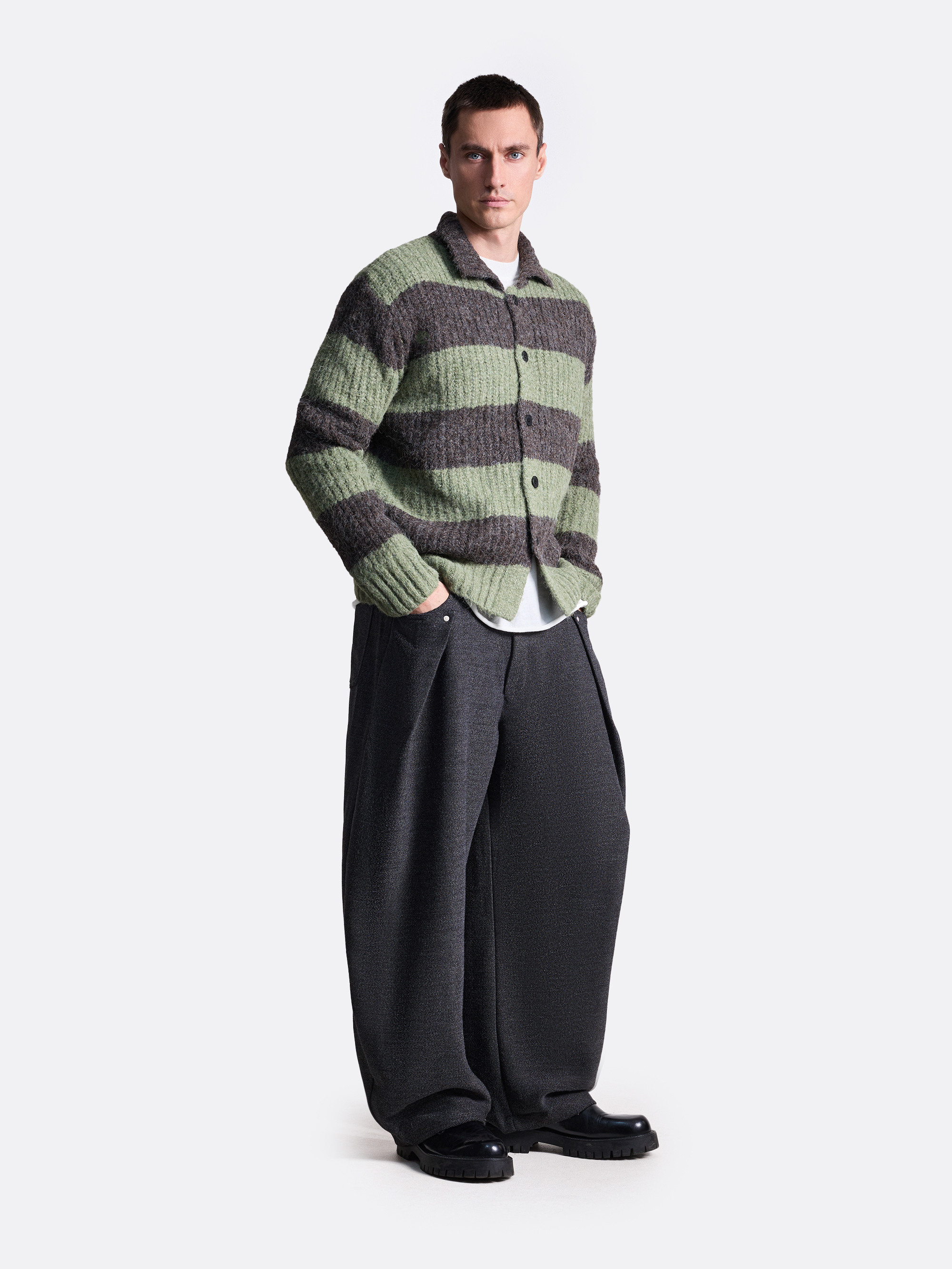 Кардиган в полоску из мягкой, фактурной пряжи. Кардиган имеет классический крой. Застёгивается на пуговицы, оснащён воротником. Отлично подойдёт для прохладных дней — сочетайте с джинсами или брюками для комфортного образа. Кардиган представлен в голубом и оливковом цветах.